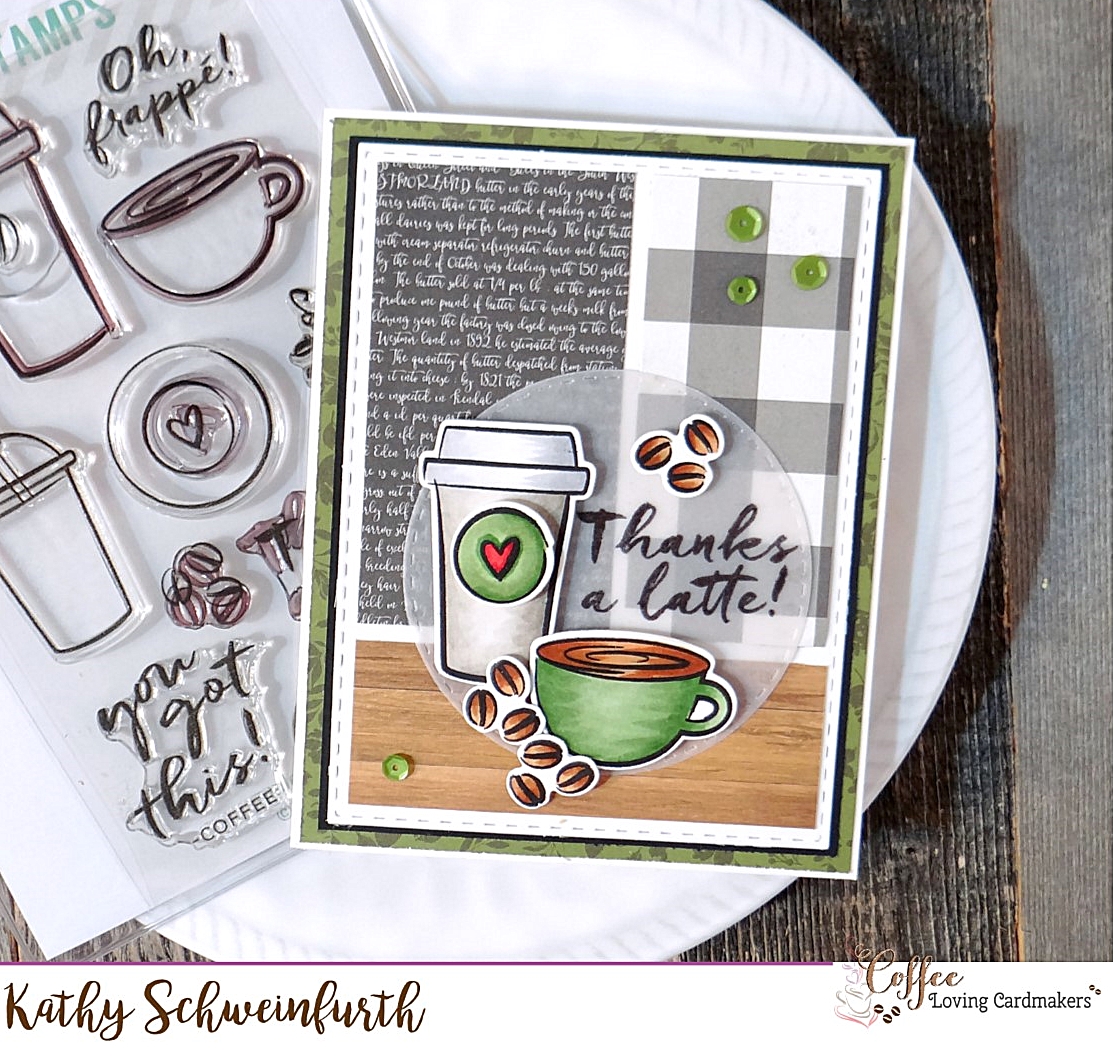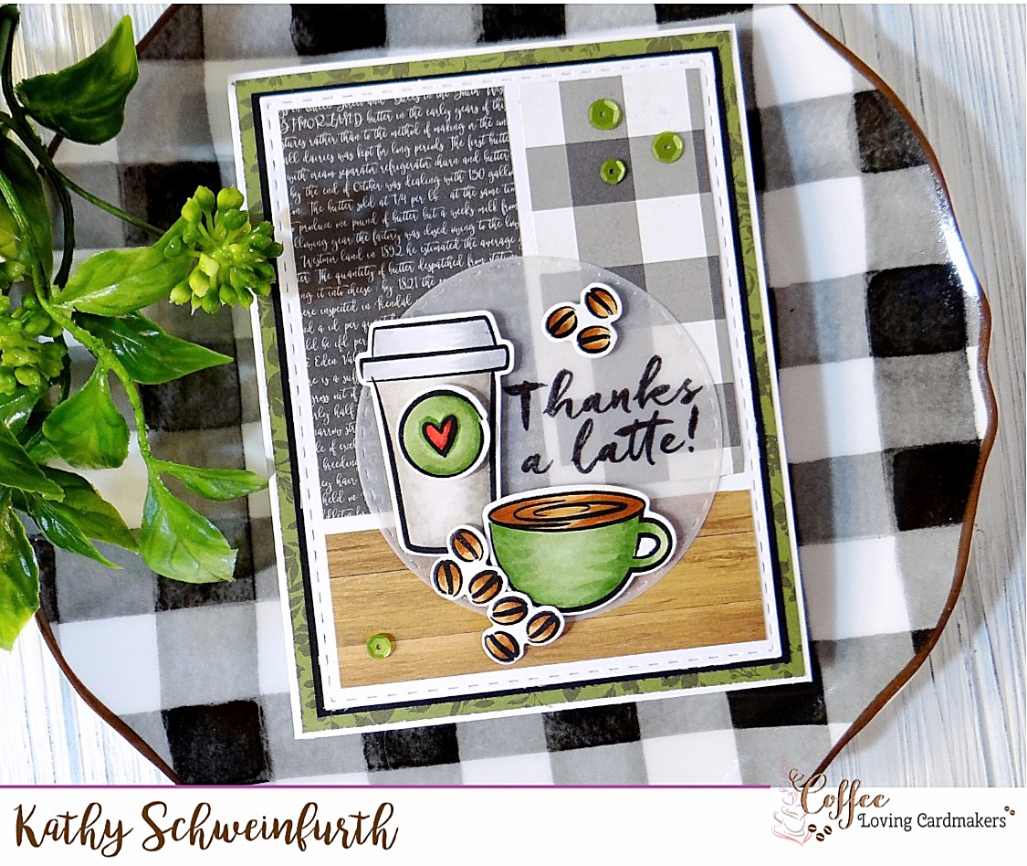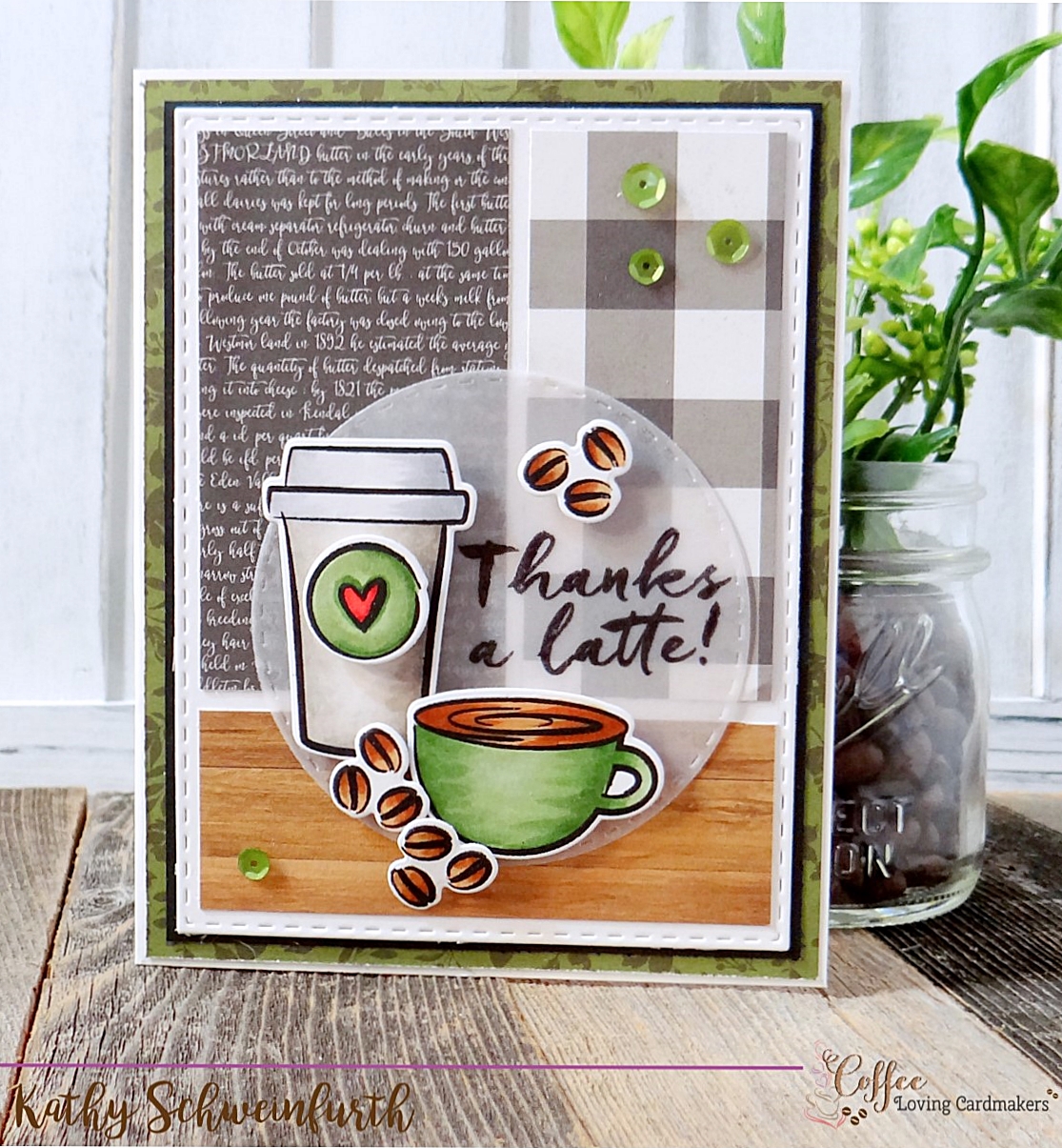 I started by layering several patterns from one of my favorite paper pads from Carta Bella – Welcome Home. I then stamped and die cut the coffee cup/bean images from an Essentials by Ellen set. The sentiment was stamped on a vellum circle die cut and then the coffee-themed pieces were arranged on it. To finish, I added a few light green sequins.