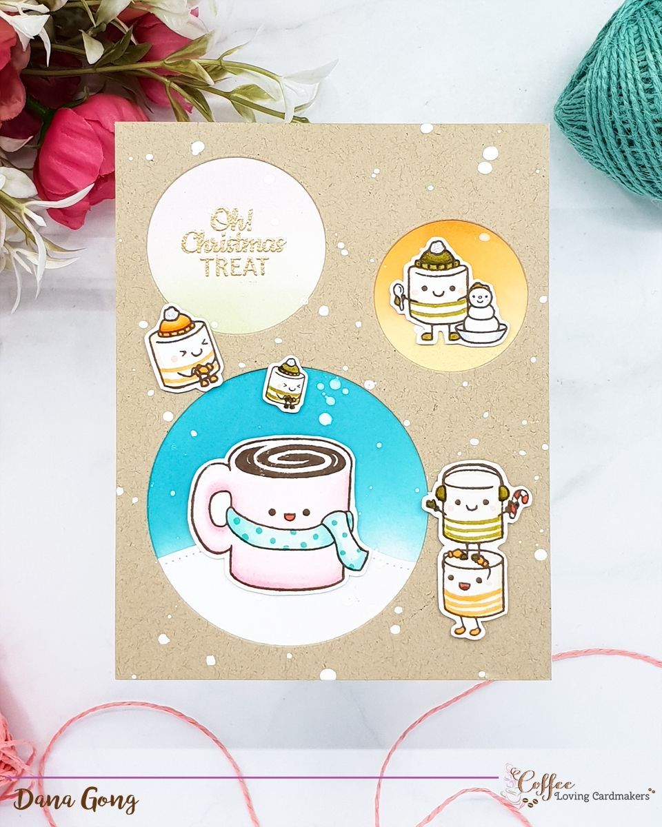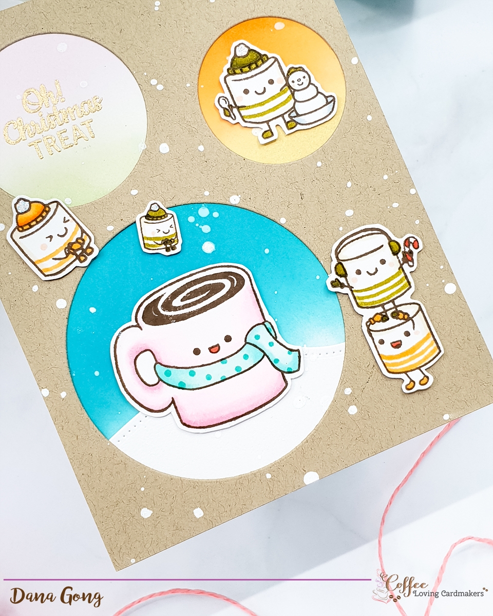 To start, I stamped mug and marshmallow friend images with Versafine Vintage Sepia. I colored them with Copic markers and fussy cut out using scissors.