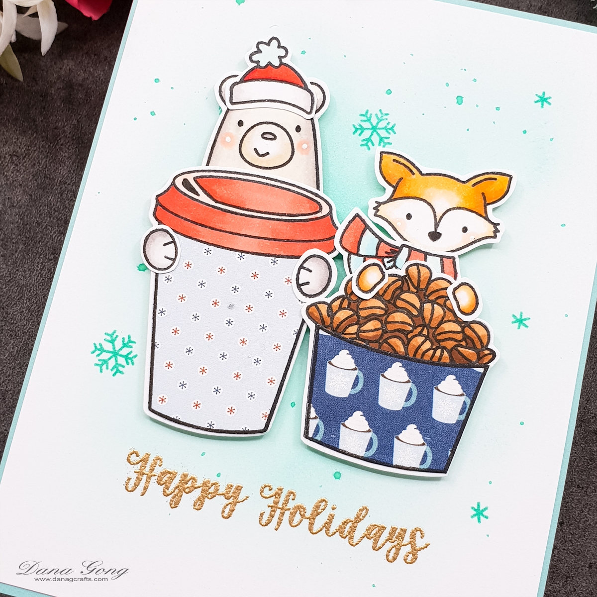 For background, I slightly ink blended it with Altenew Volcano Lake and stamped snowflakes with same ink. I splattered Volcano ink with clean water using paint brush here and there. Once dried, I gold heat embossed a sentiment from Avery Elle Polar Peek-A-Boo Pals using Altenew Rose Gold Embossing Powder.