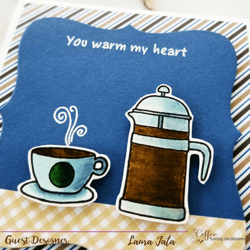 I then decorated the outside of the card using patterned paper by YNS called ‘Crazy for Coffee’ and added a die cut layer of blue cardstock.