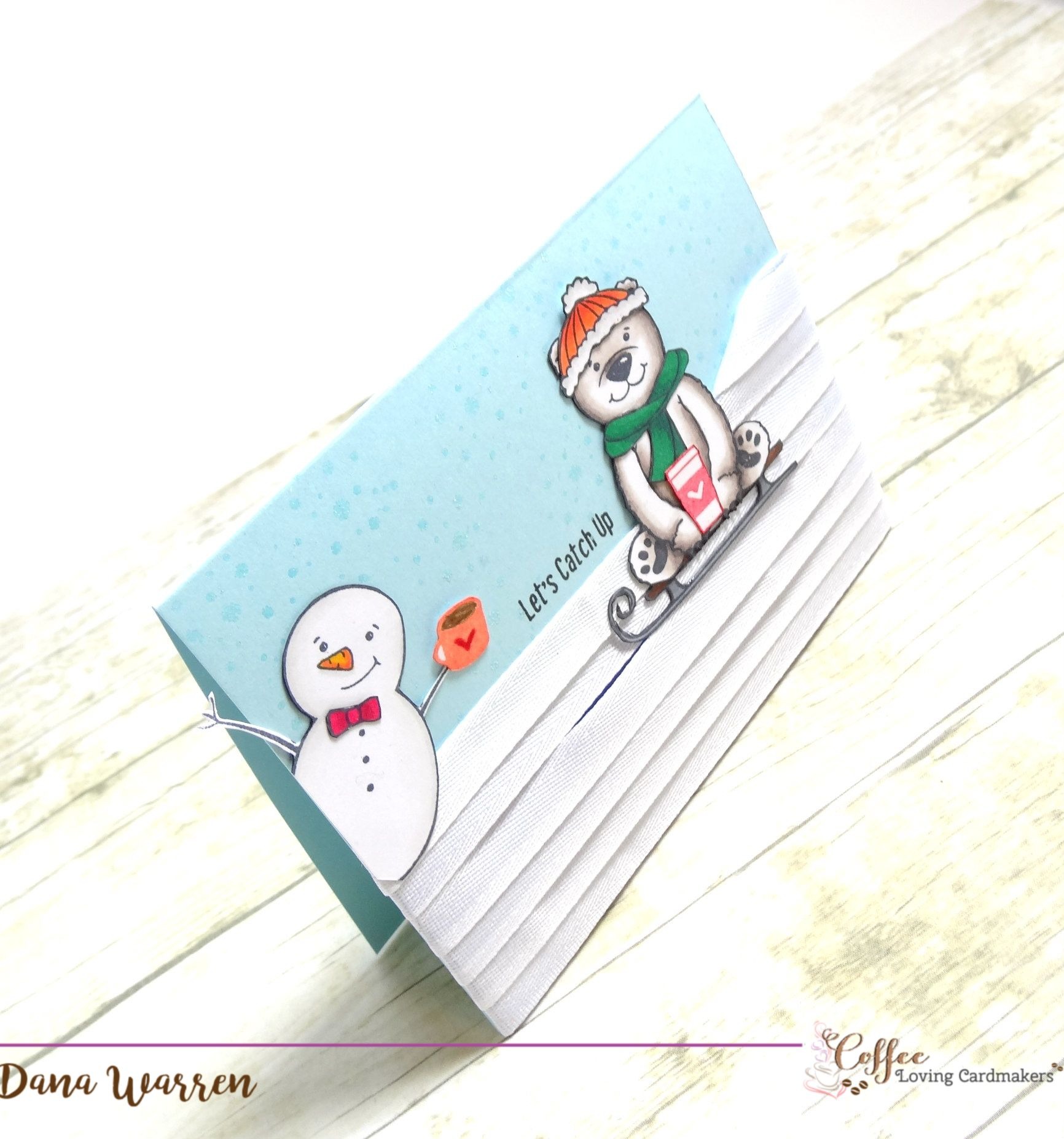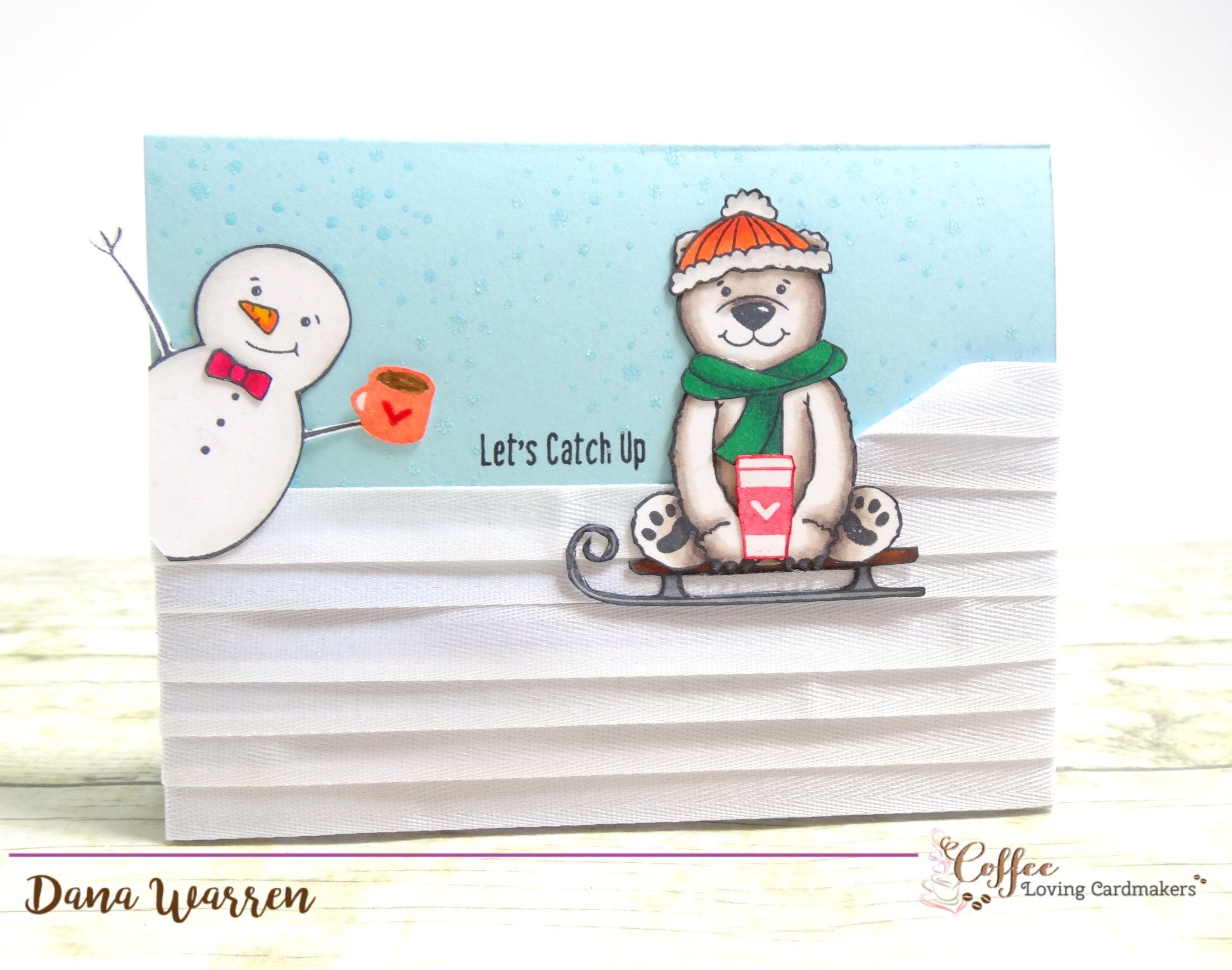 Before I added my snowy friends I used The Greetings Farm Perk Up stamp set for the sentiment. I thought the Let’s Catch Up sentiment was perfect for my winter pals and all that was left to was add them to the card!