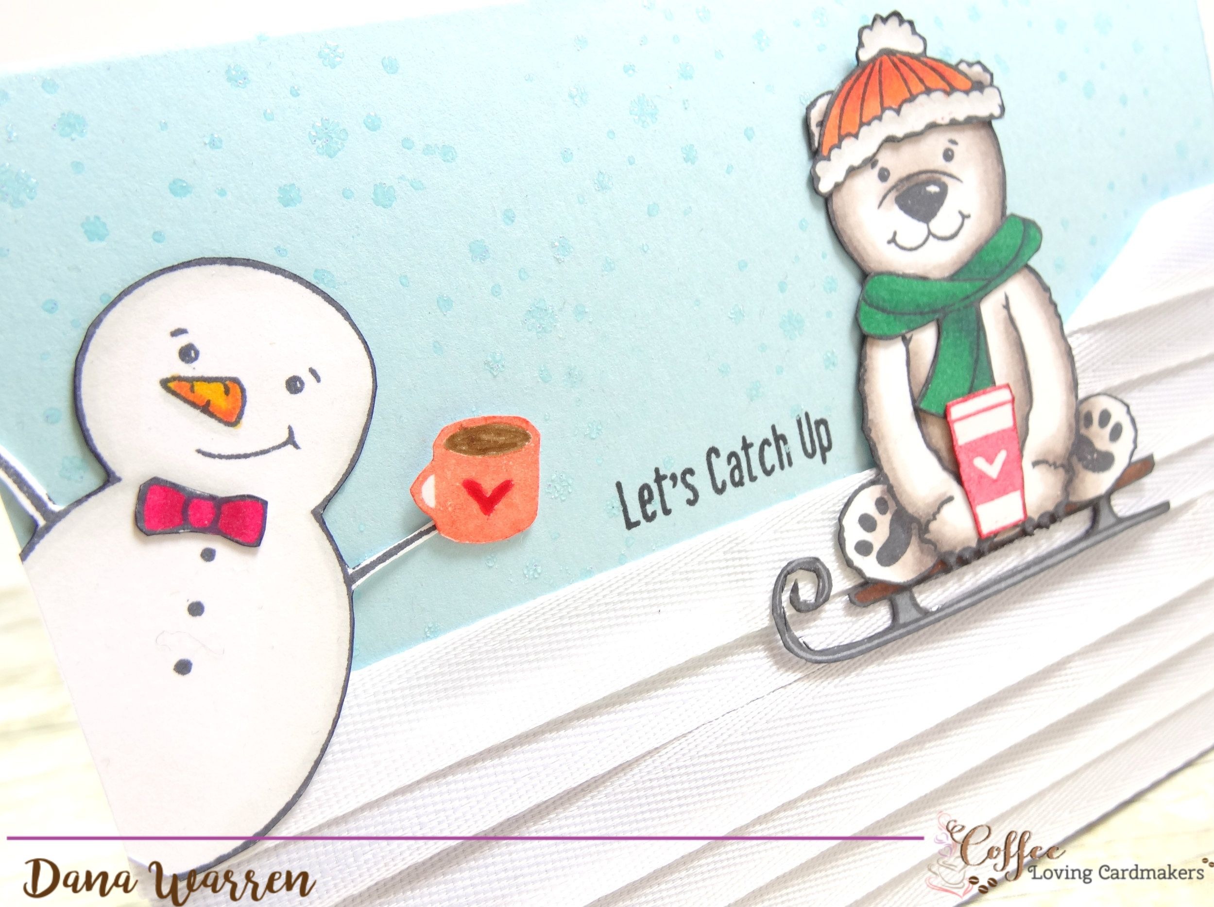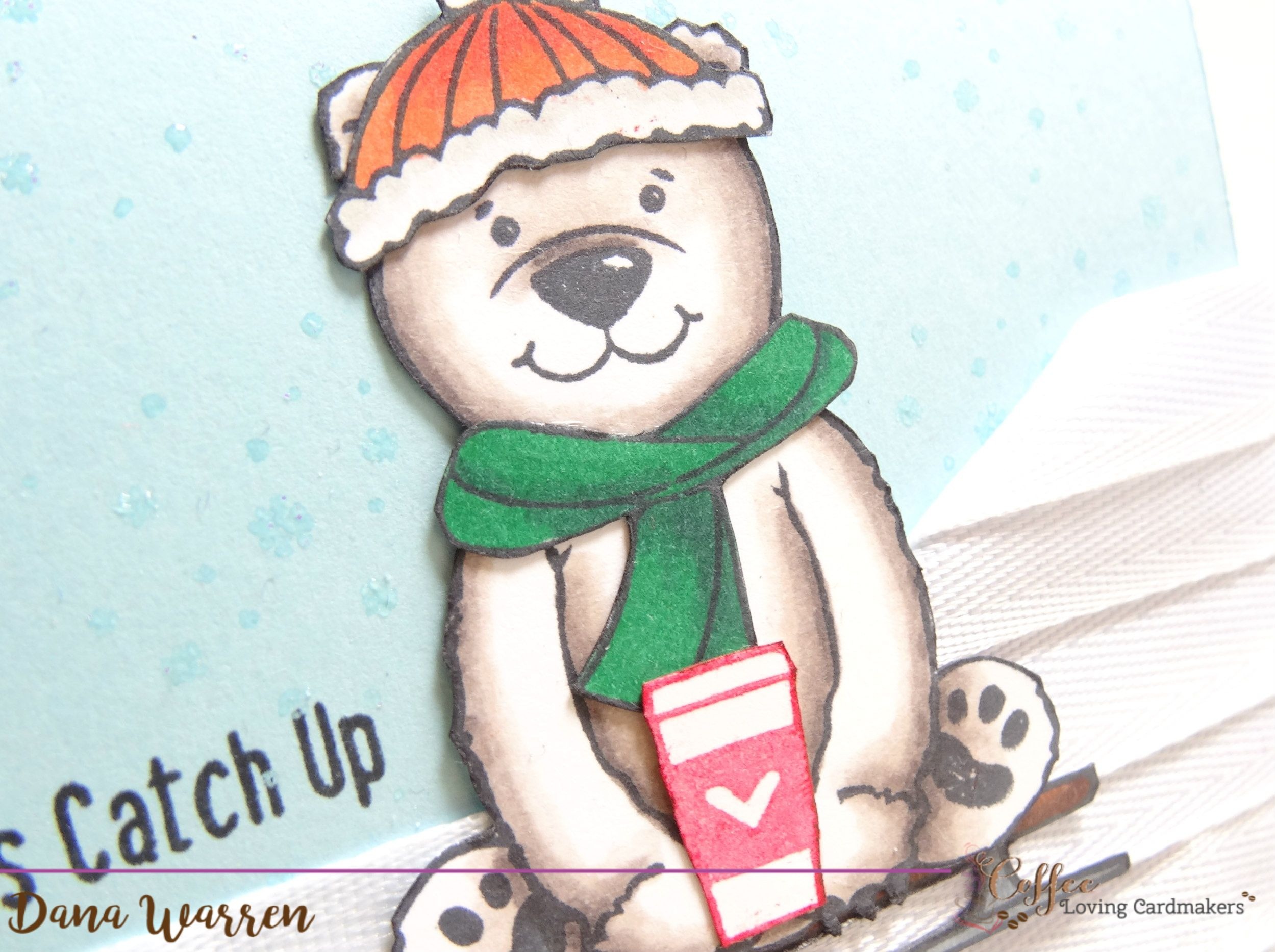 Then I stamped the bear and snowman, along with some winter accessories and coffee, of course. I used my Spectrum Noir markers to color everything, then I fussy cut out all the images. I added the hat, scarf and coffee to the bear, then adhered him to the sled. The snowman got a bow and an orange coffee cup.
