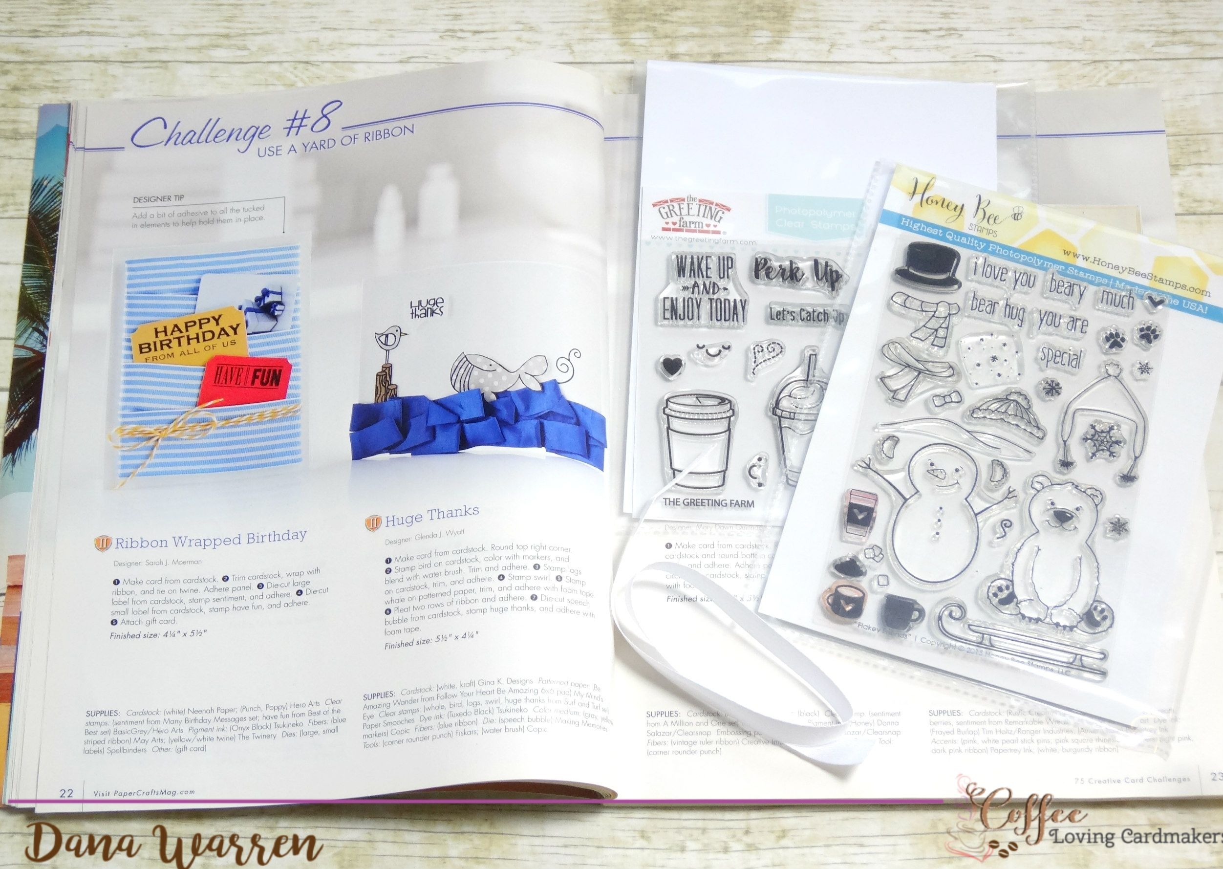 Challenge #8 – Use A Yard of Ribbon. The magazine has four cards and two of them wrap ribbon around a panel. One has very wide ribbon the other thin. Another card did a messy pleats of blue ribbon, so it could be the ocean for a whale! The last card adhered strips of printed ribbon, trimming it off at the panel’s edge.