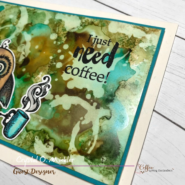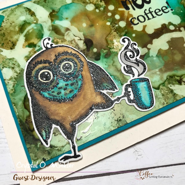 Hello! Crystal here with some truth… I just need coffee!! Haha… but really, I’m sharing a fun card with an alcohol ink background using the Alcohol Lift Ink and of course, one of my favorite owl stamps from Rubbernecker Stamps.