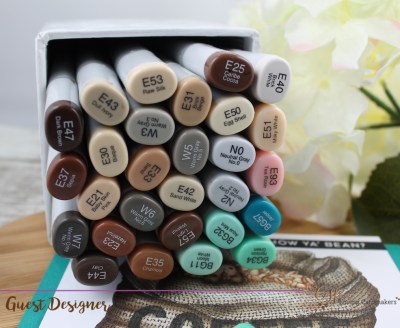 I went looking through my cardstock to find something that matched the coffee cup and found a sheet of Peacock cardstock by Simon Says Stamp, which was a pretty close match, so I made a card base from a half piece of Peacock and then adhered the panel with foam tape.  Here’s a photo of the Copics I used, but as there are a lot of E’s in this container, I’ve split out what I used for each element of the image.