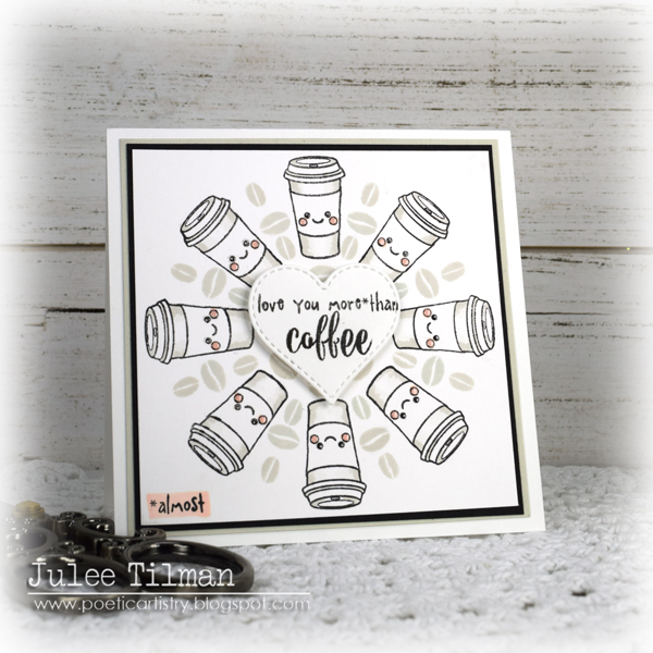 I stamped the love you more* than on a heart shaped die cut and then masked off just the coffee from another sentiment and stamped it. This is popped up in the center of the wreath and then I added the fine print *almost in the corner and highlighted with a copic marker. I finished off this simple square layout with thin black and stone cardstock mats for a finished card sie of 4.25″ square.