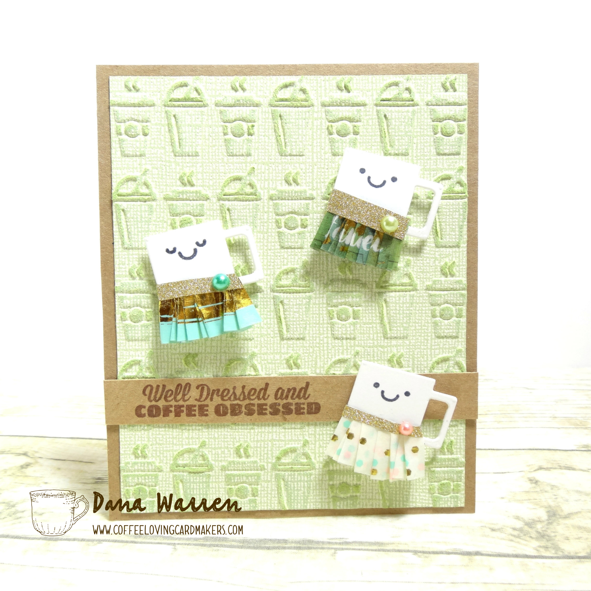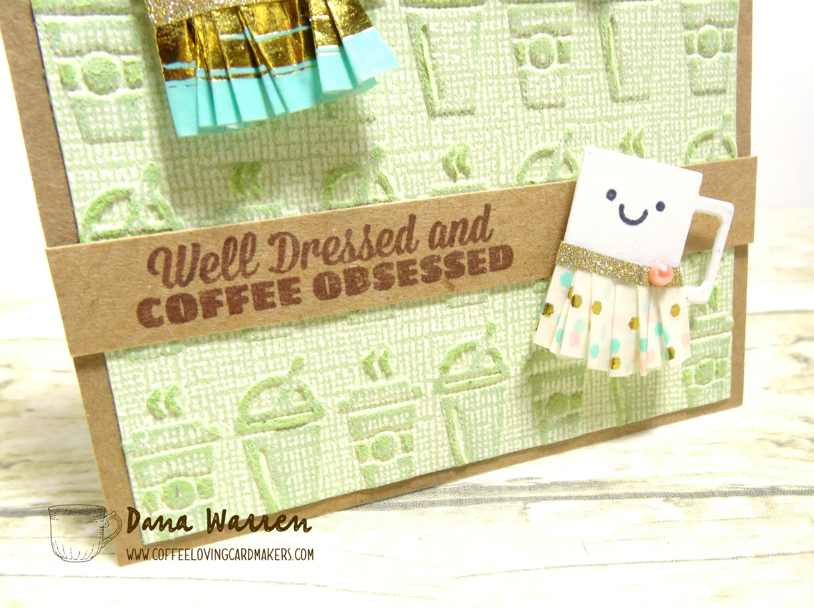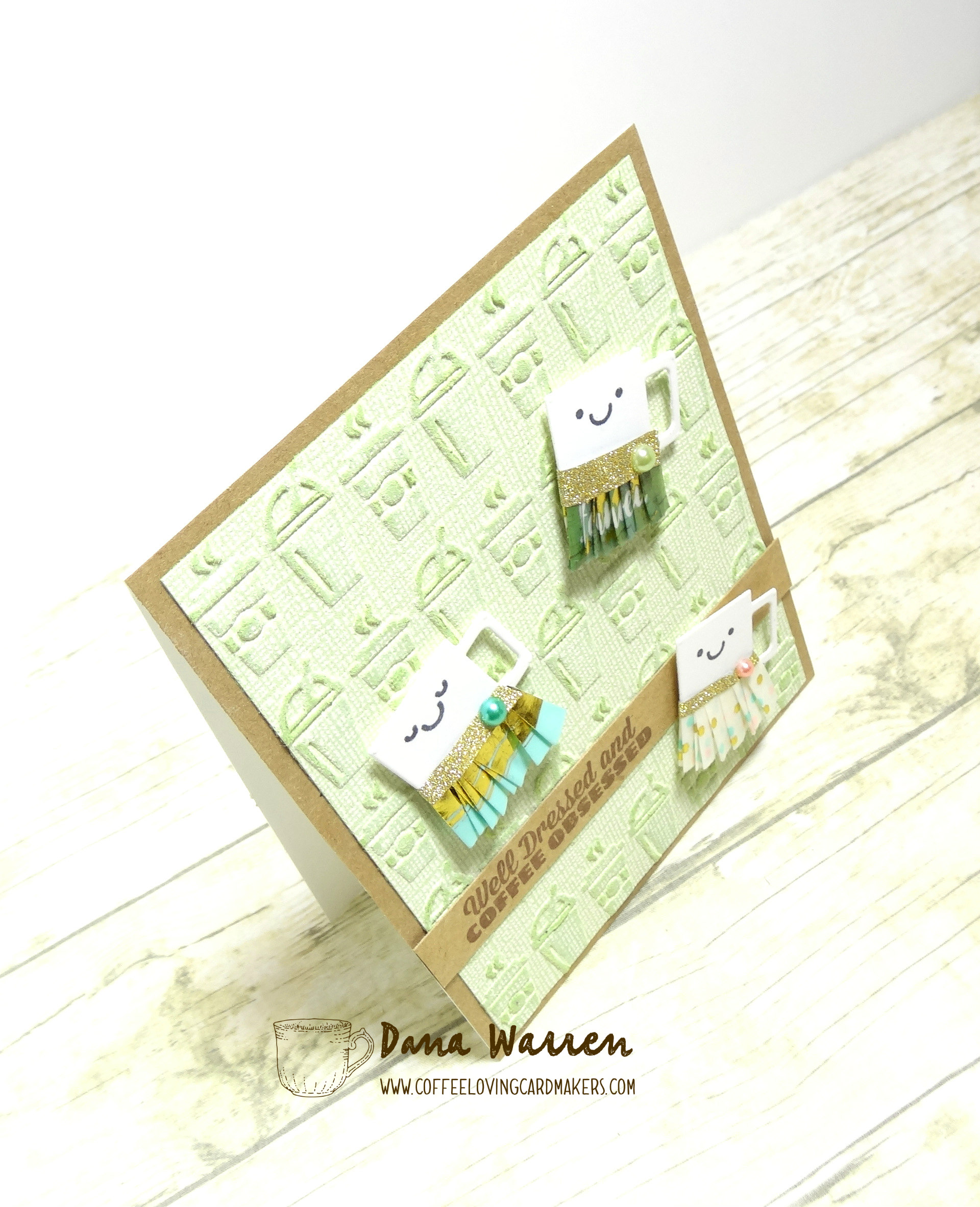 For the background I used Tim Holtz On the Go Embossing Folder. I trimmed it a little and added it to a panel of Kraft card stock. For the sentiment I trimmed a strip of Kraft cardstock and then used Art Impressions Latte Love Set. The sentiment is perfect for my cute little ruffle coffee cups!