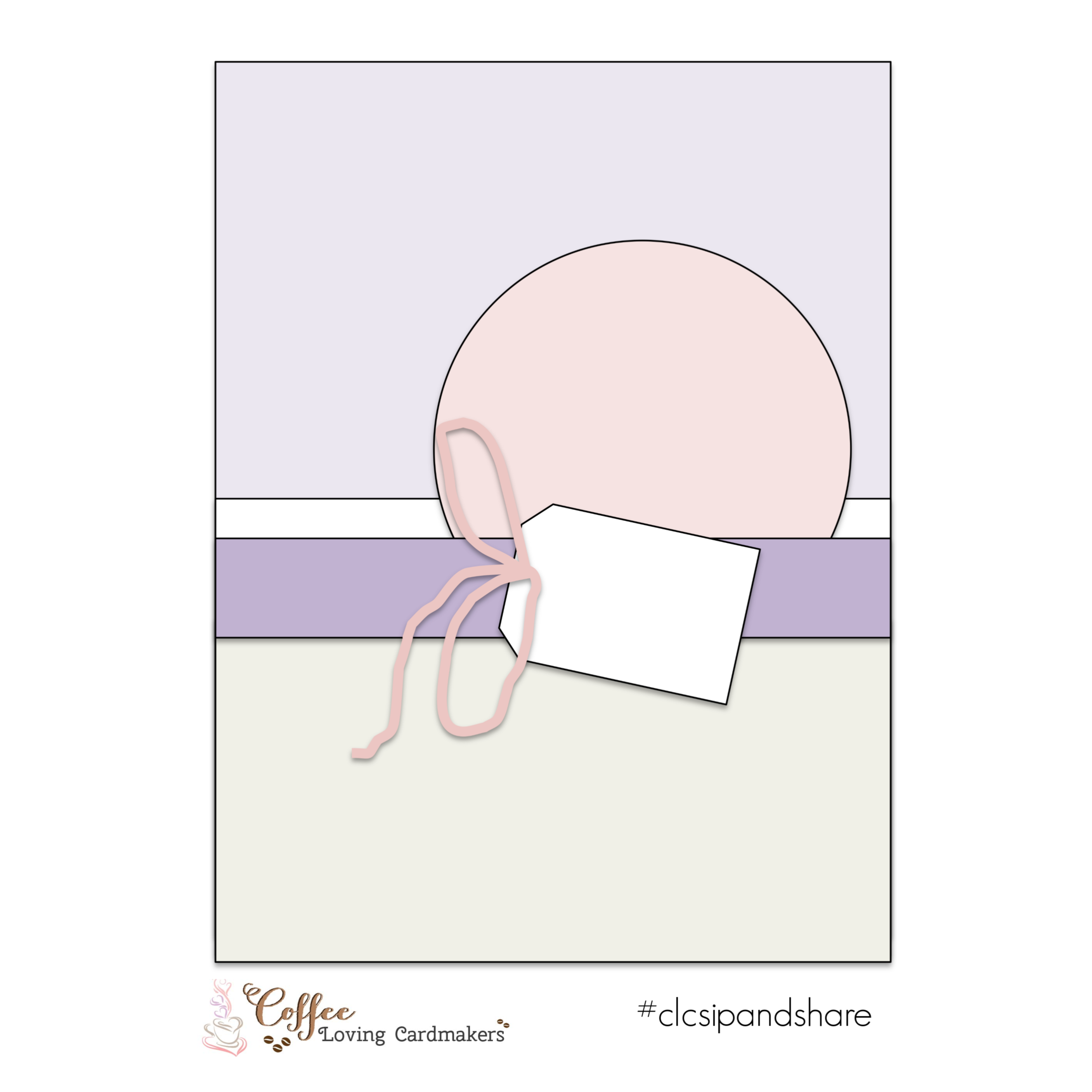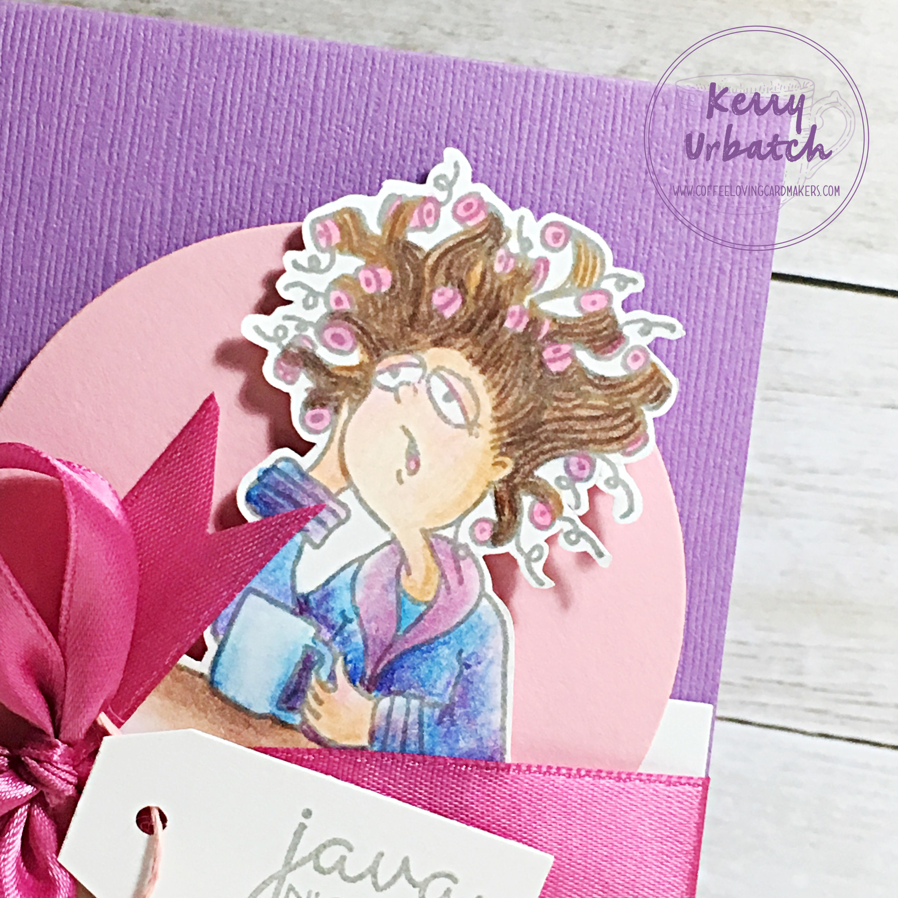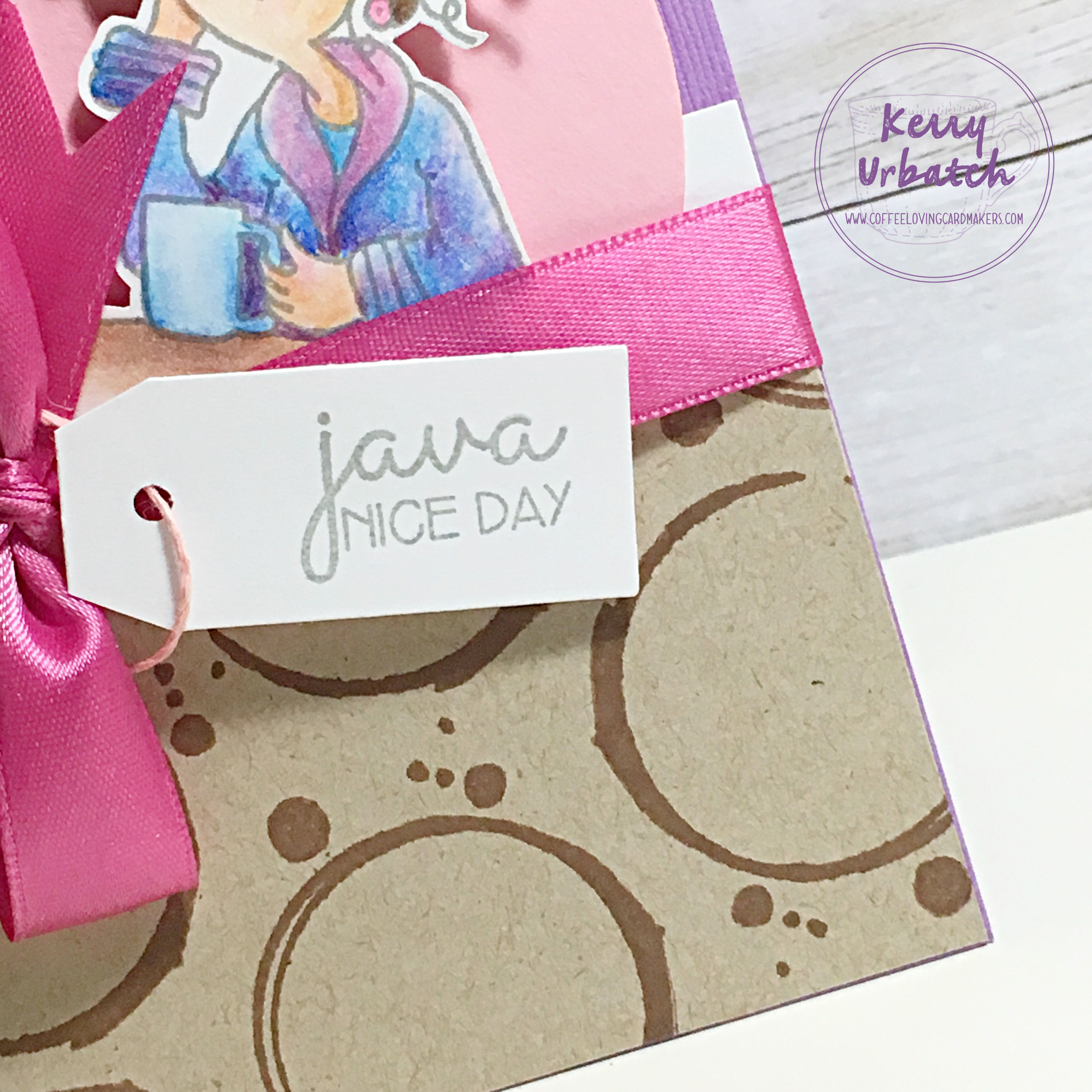 So to create my card, I started out by selecting a card base color that would work well with the image. I pulled some old textured cardstock from my stash that was in this pretty plum color. I don’t really care for purple, but this color is a favorite. I then stamped some kraft cardstock with the coffee stain image (and Catherine Pooler ink) from the Inky Antics Coffee Break #1 set and then attached a bit of white cardstock above that. I mounted it onto the card and then attached the colored image to the leftover pink circle that was diecut from the original shaker card.