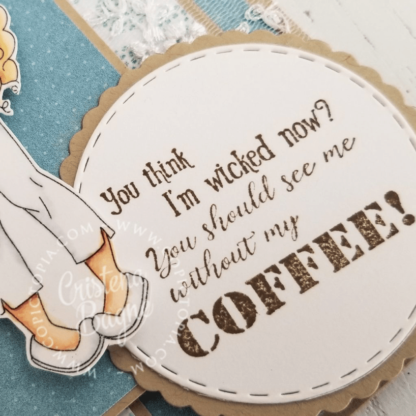 I added the sentiment Wicked from Rubbernecker Stamps to the card. I thought it would work perfectly with the size of the coffee that Avery is holding, plus it really made me laugh. I stamped it on some Whipped Cream cardstock with the Distress Walnut Stain ink from Ranger.