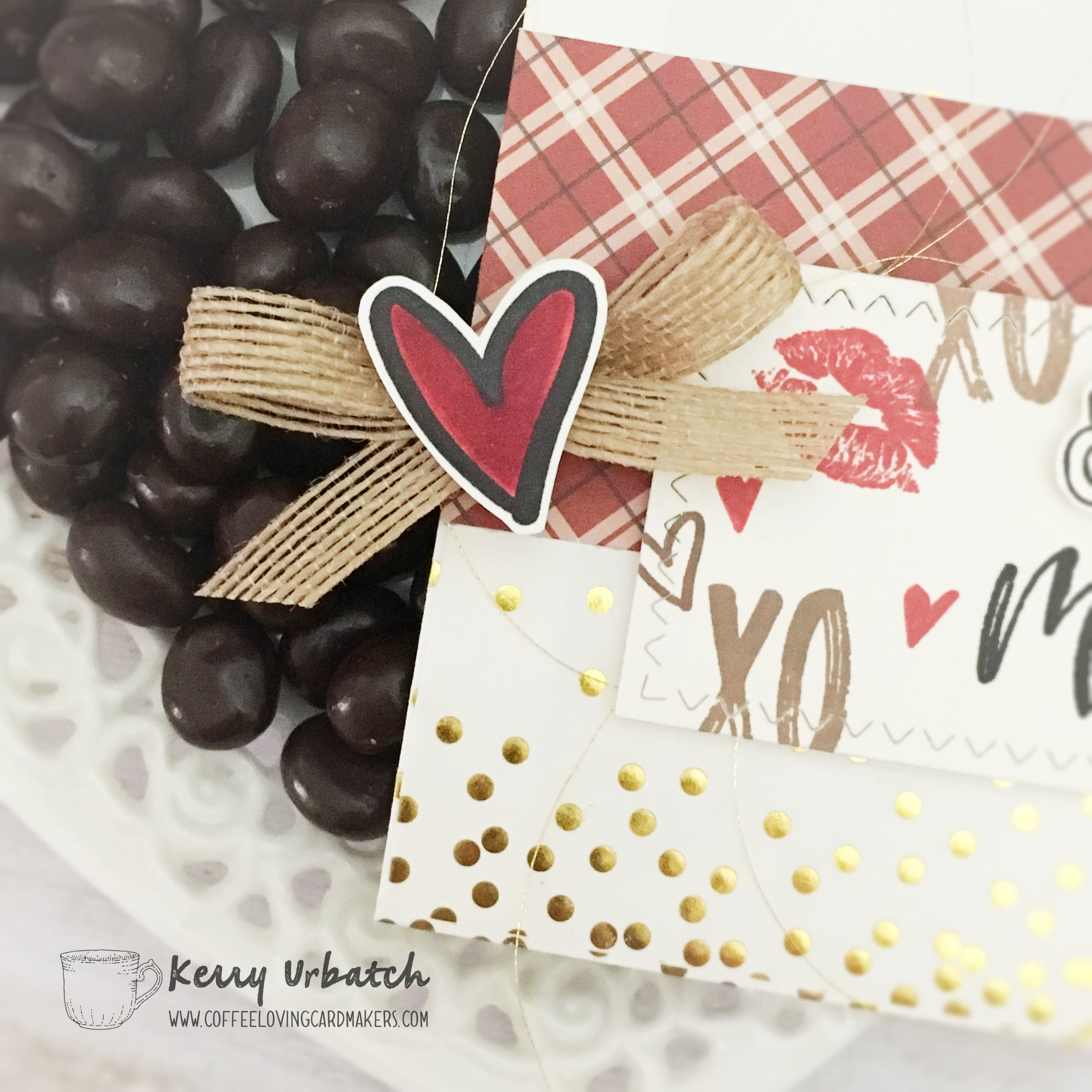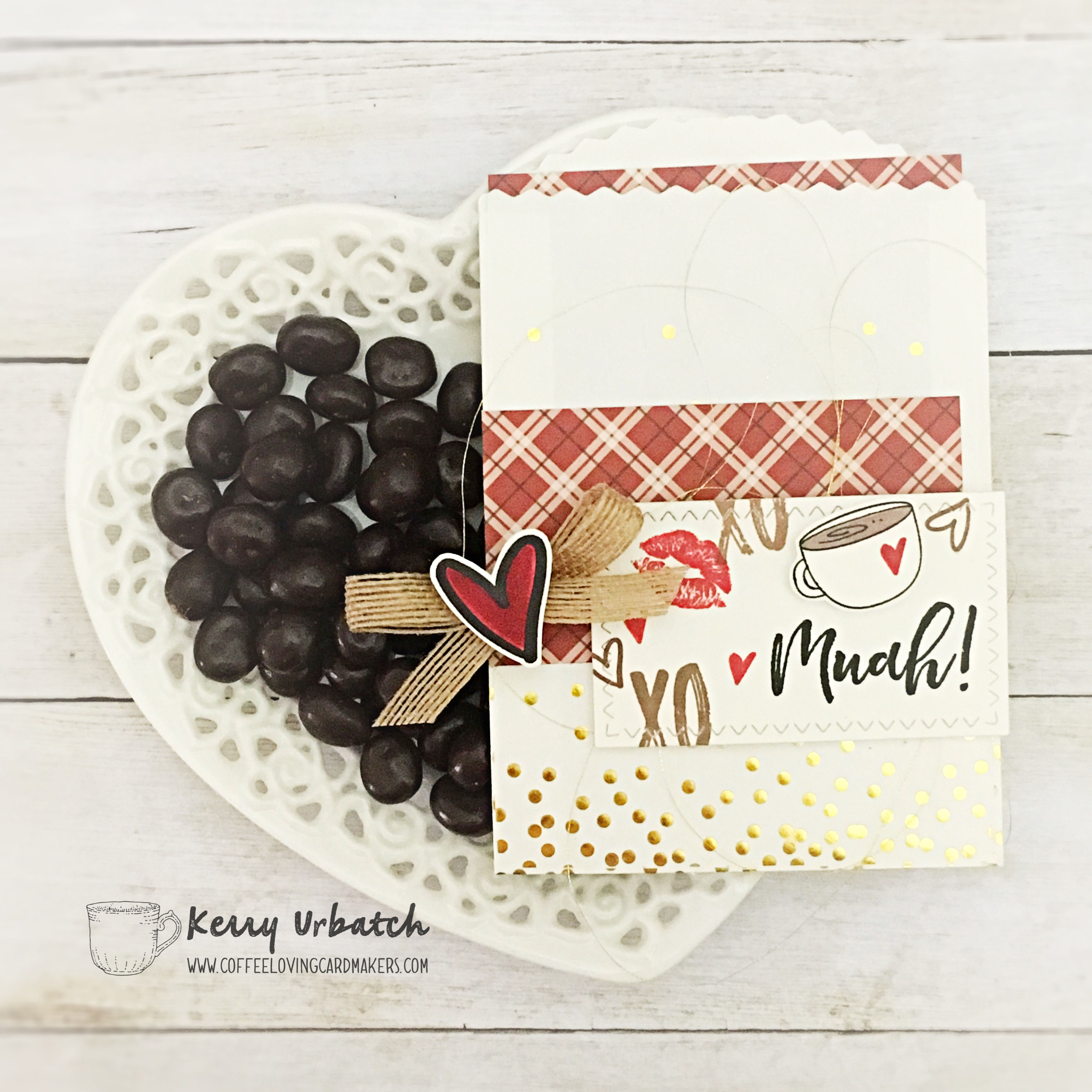 Hello there Coffee Loving Crafters! It’s Kerry here and I’m back with another fun Sunday Sip. This week, I created this cute little treat bag to give to someone special. We’re having a Secret Cupid event all week next week at school and it’s so fun to share some sweet treats all week long. I’m being a super sneaky Cupid because I didn’t sign up for the event. Hee hee…I’m going incognito and will be sneaking someone different each day. HA HA. This little giftie is the first treat…It’s filled with dark chocolate espresso beans and a gift card to our favorite coffee shop.