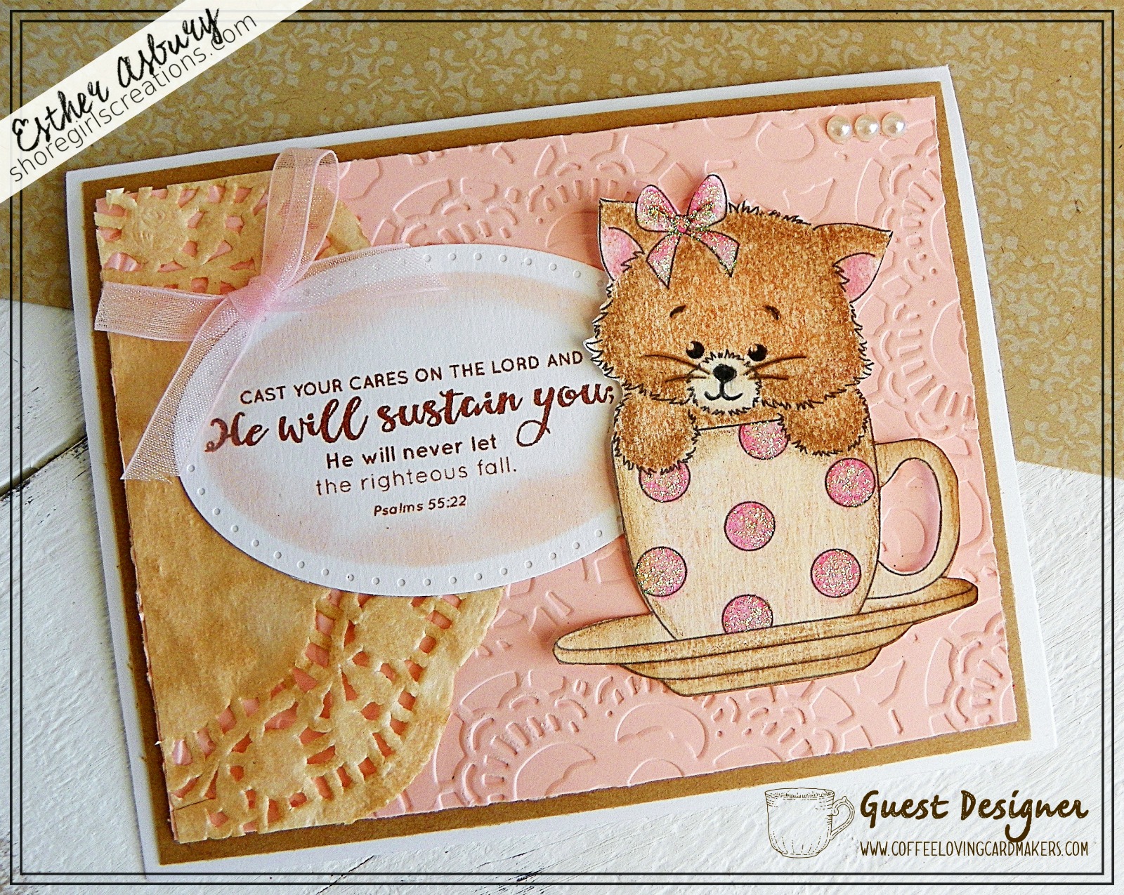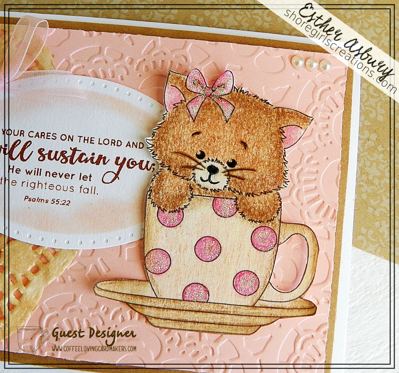 Hello friends! Today I have a soft pink card featuring an adorable little “kitten in a cup” from an Etsy shop I recently discovered called Pickled Potpourri.