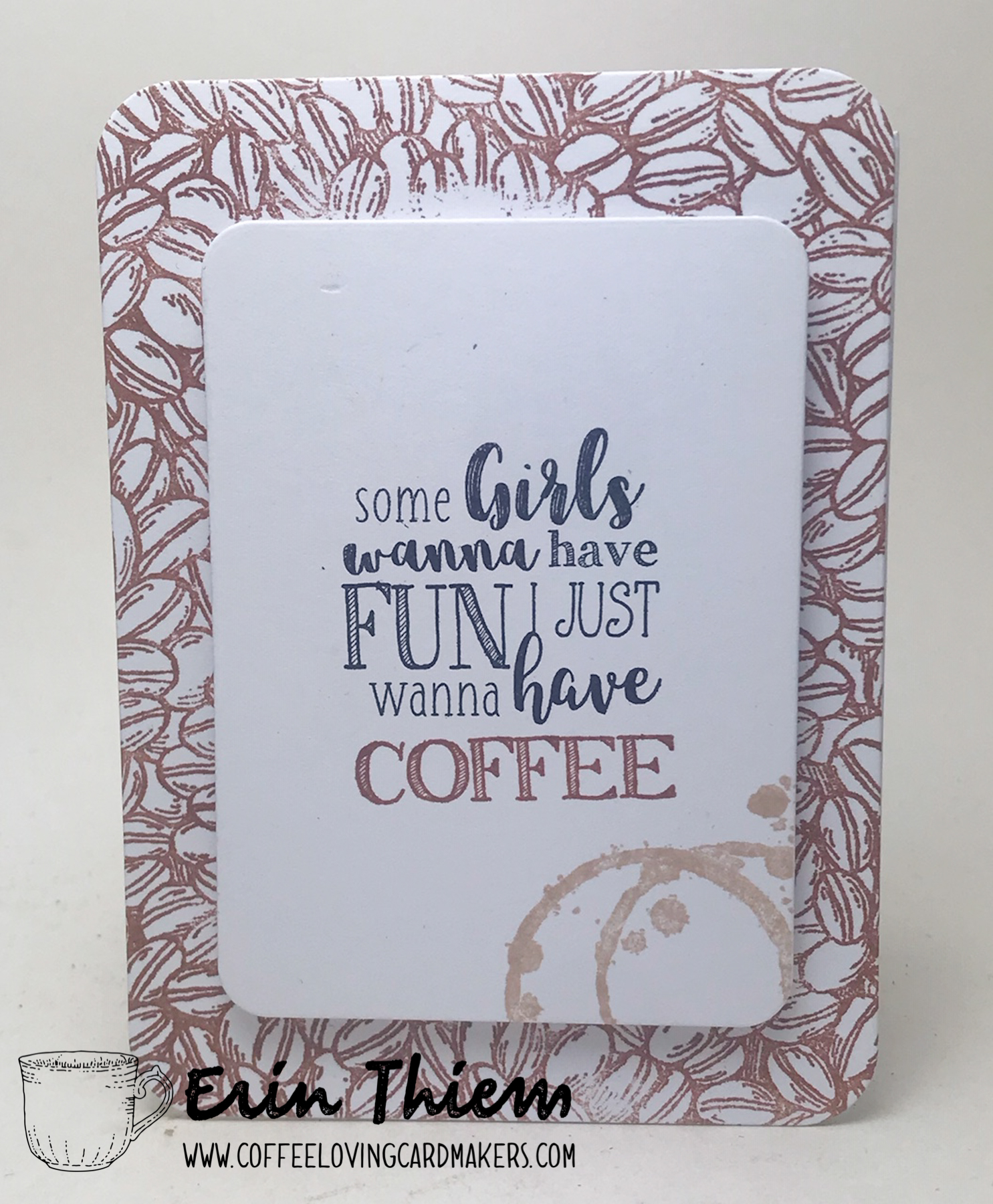 Erin, from Homemade Cards By Erin, here.  Since I have so many coffee stamps and goodies, sometimes I like to mix it up and make a coffee-centric card with a sentient as the main focus.  For this card I paired the Rubbernecker background stamp with the SugarPea Designs sentiment.  I added some MFT dies to add the rounded corners and I was good!