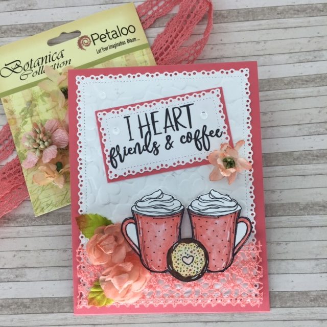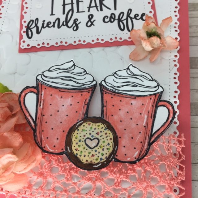 I started layering the cups and sentiment, when I remembered that back in the Fall I bought some beautiful ribbon from The Stamp Simply Ribbon Store. The Pantone Color of the Year for 2019 is Coral! After adding the ribbon to cart, a suggestion for flowers was at the bottom. So I added pretty silk flowers from Petaloo too! The ribbon is perfect as a wide strip behind the cups and flowers. I hope you like how it turned out!