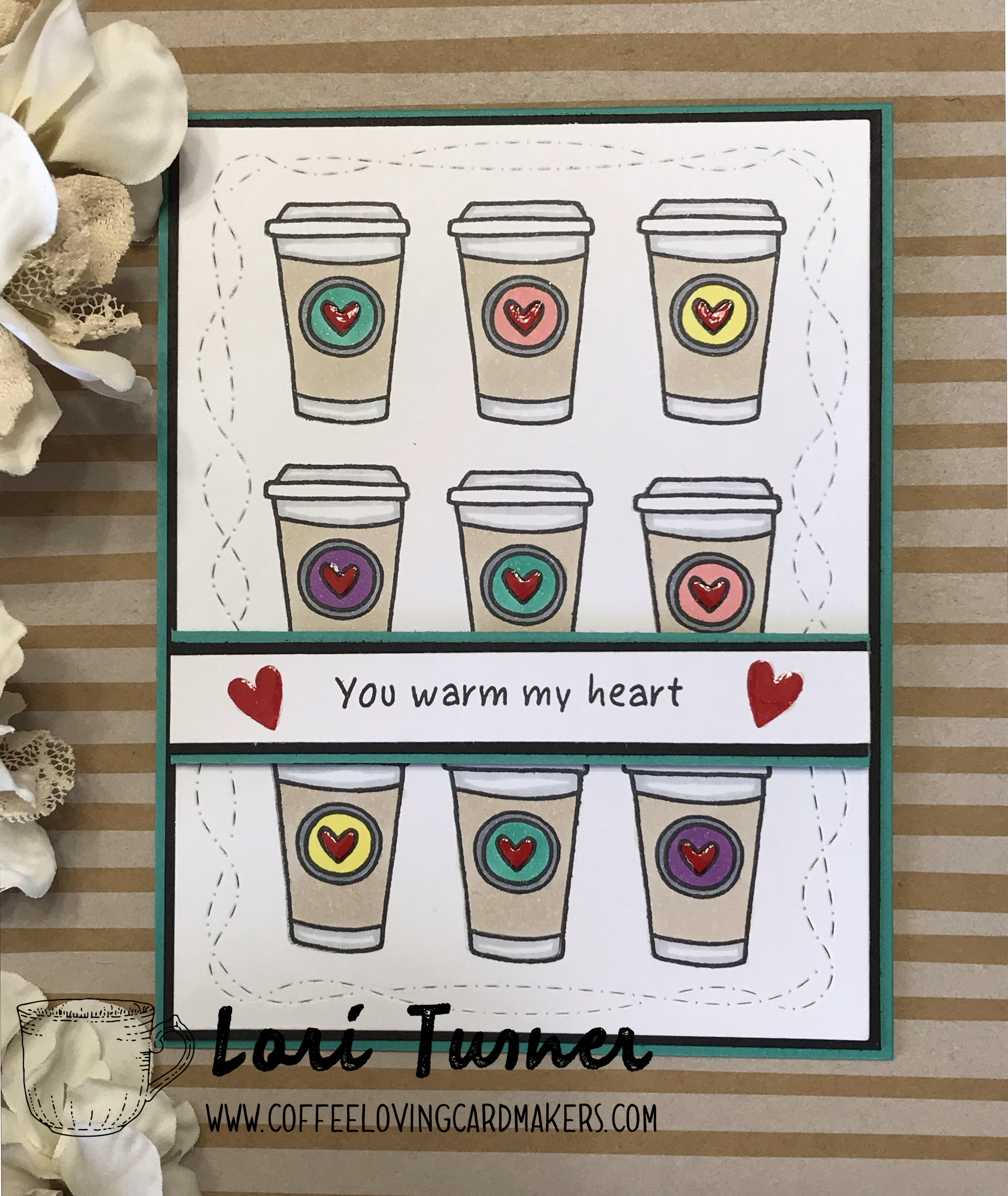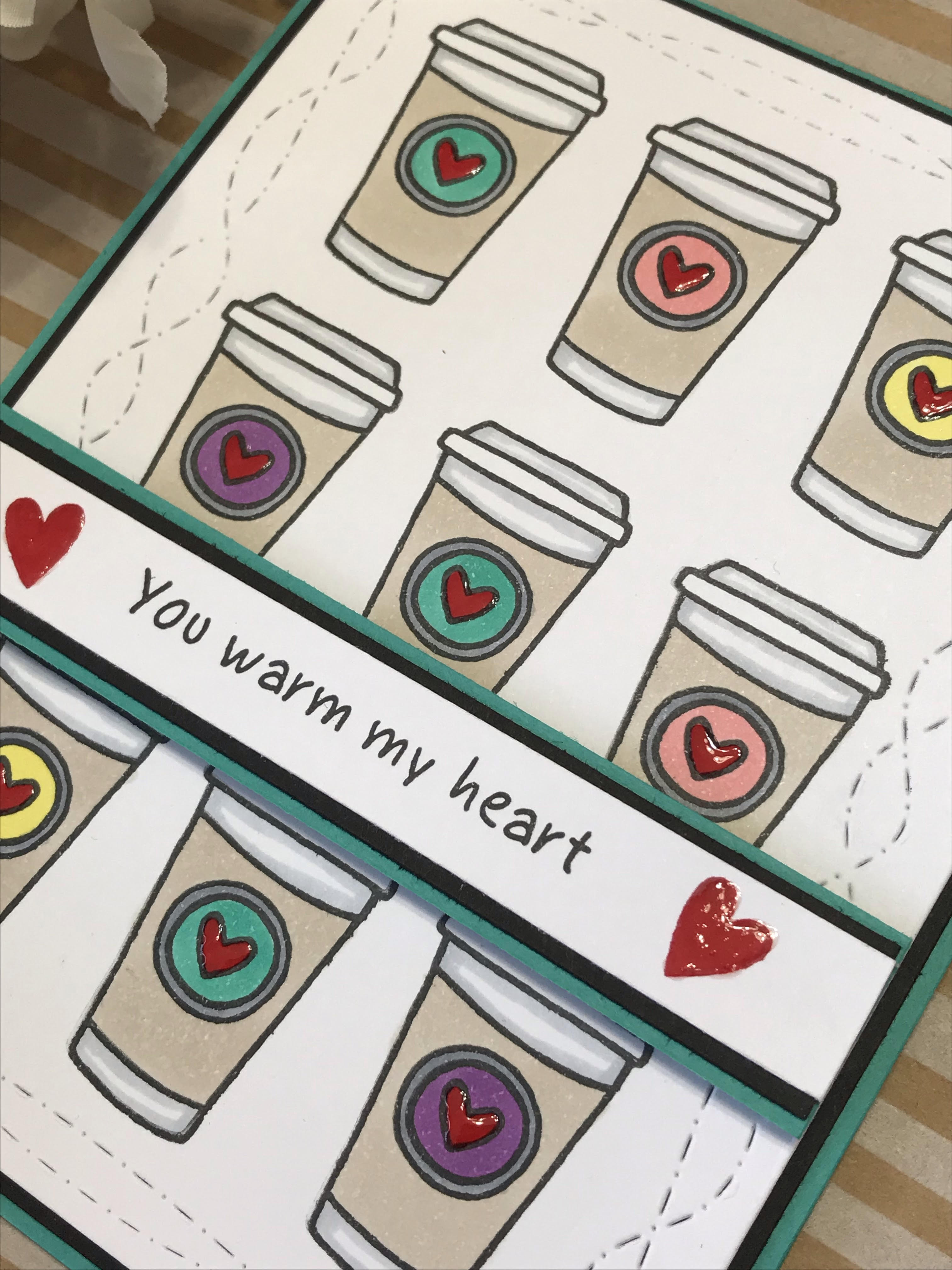 I had so much FUN creating this cute card using my stamps from Jane’s Doodles! These little to-go cups are just so darling and you can color them up in any color combo you’d like! I stamped them numerous times onto Xpress It! Copic paper, colored them all and then cut the panel out with my wonky stitched rectangle die from Craftin’ Desert Divas…