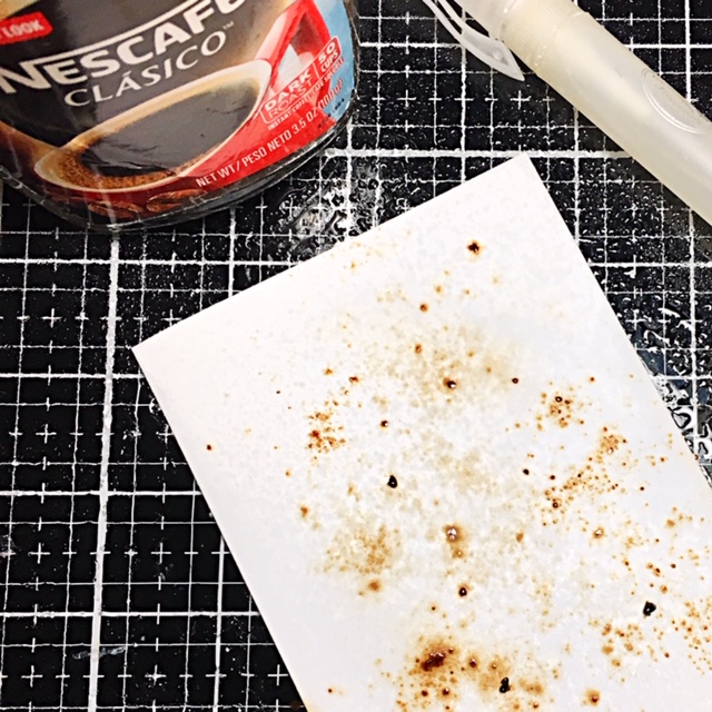 When I got home, I headed to my cupboard and grabbed the instant coffee that I use for my chocolate baking dishes. I really don’t drink that stuff but it works great when wanting to give chocolate a richer flavor. Anyway, I brought the bottle of dark Nescafe down to my workspace and sprinkled a bit onto some paper. I spritzed some water on the paper and let the grains bloom…