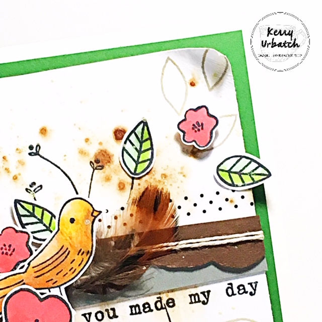 I also colored the bird, leaves and flowers with Copic markers and added some hand-cut scalloped paper to the card for added playful look.