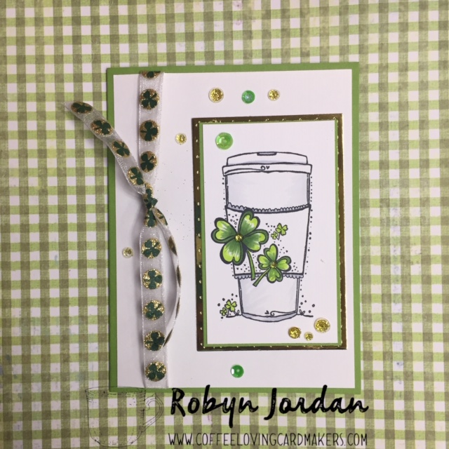 This card was pretty easy to make! Very little coloring is necessary with this great stamp from Unity! The hardest part was trying to make a bow with this particular ribbon. It’s not the easiest to work with, so I ended up tying a knot instead. I used products from 3 of our Super Sponsors on this card! So thankful for our Sponsors! I used the Luck To Go Stamp from Unity Stamp Company for the image, some awesome Gina K. Designs cardstock ( new to me, and I love it!), and Gold Sparkle Crystals from Studio Katia (so pretty)!