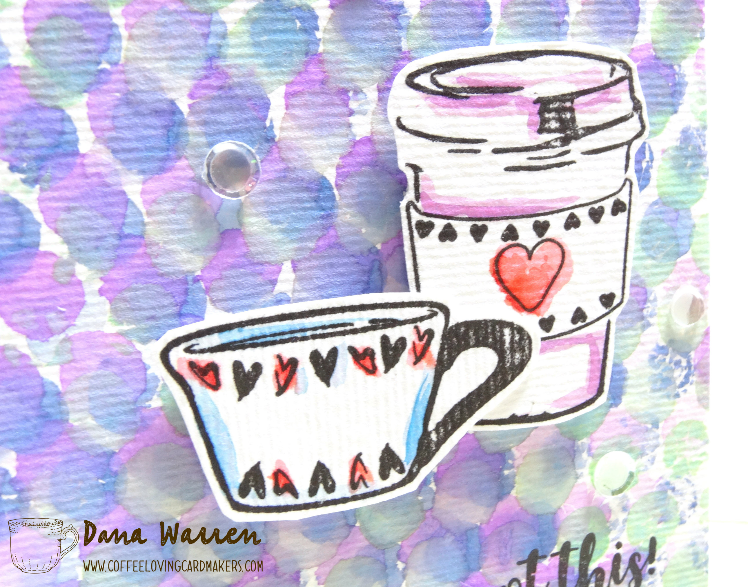 Last, I stamped the coffee sentiment below the cups and added a few sequins scattered around for some sparkle!
