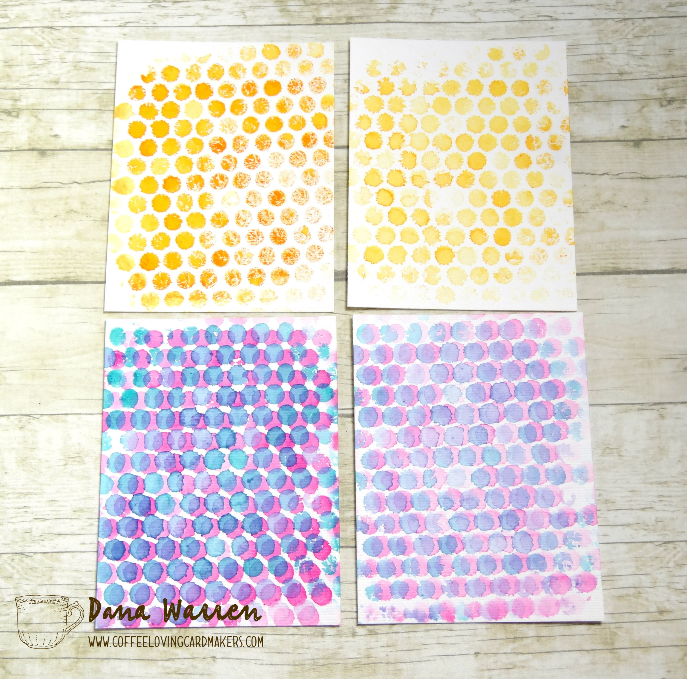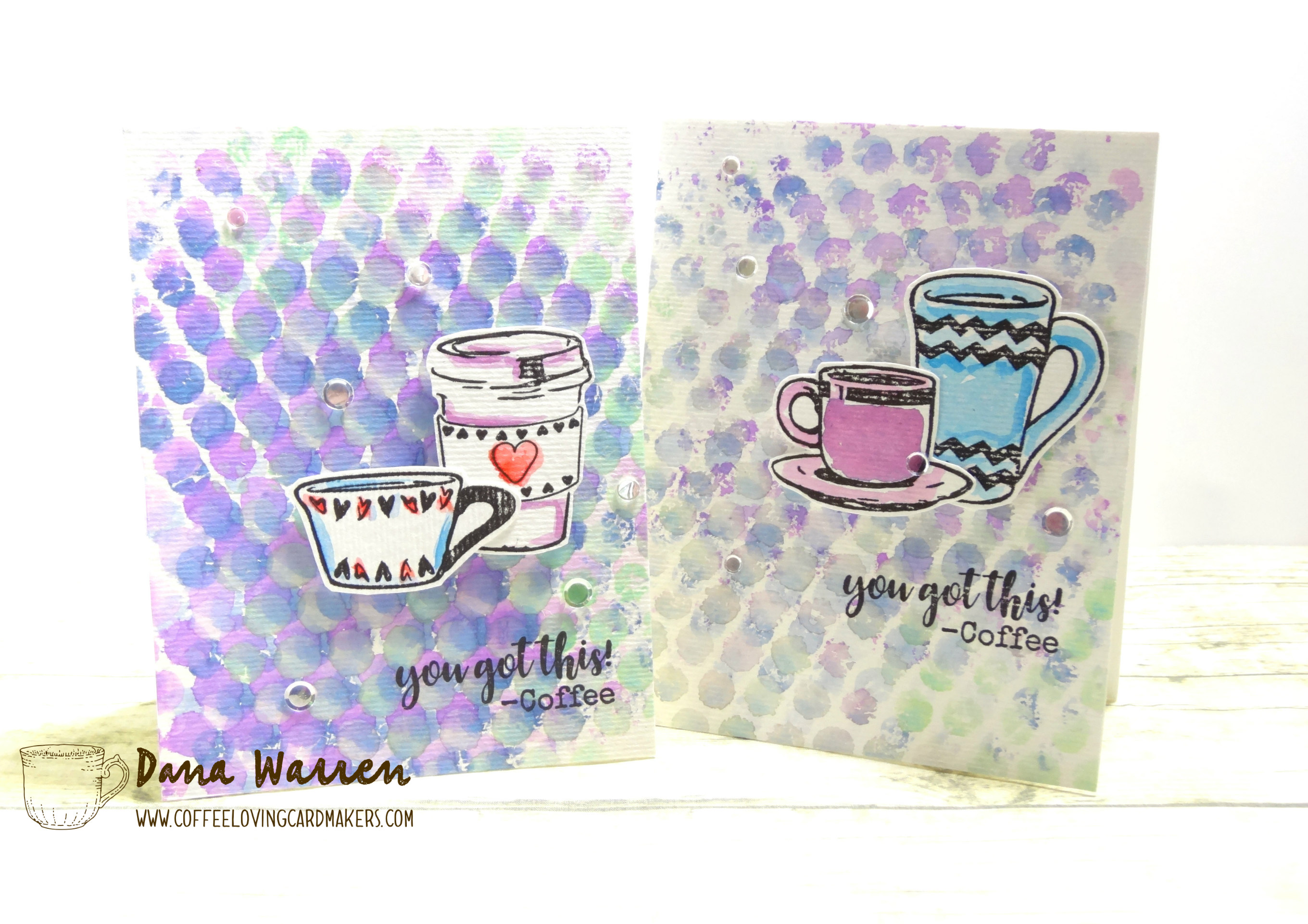 But I was not done experimenting! Next, I used Distress Oxide – three different colors: Wilted Violet, Faded Jean and Cracked Pistachio. I ended up using these two backgrounds to make my coffee cards!!