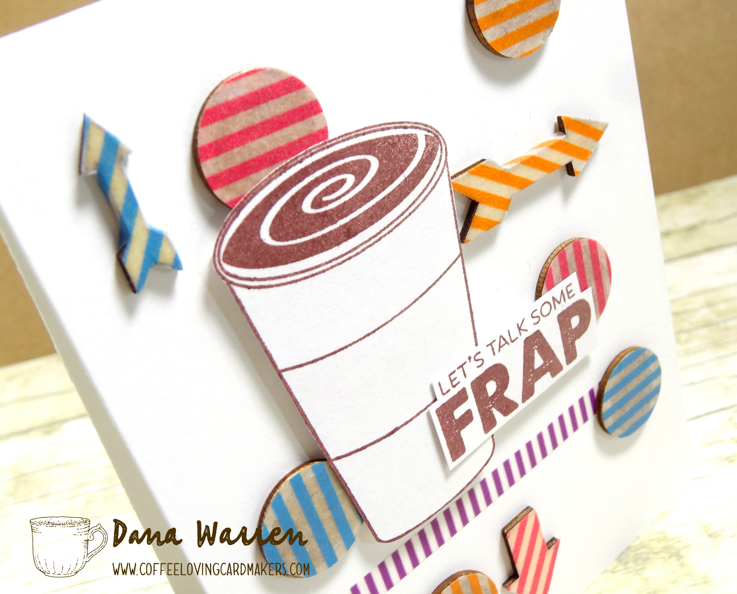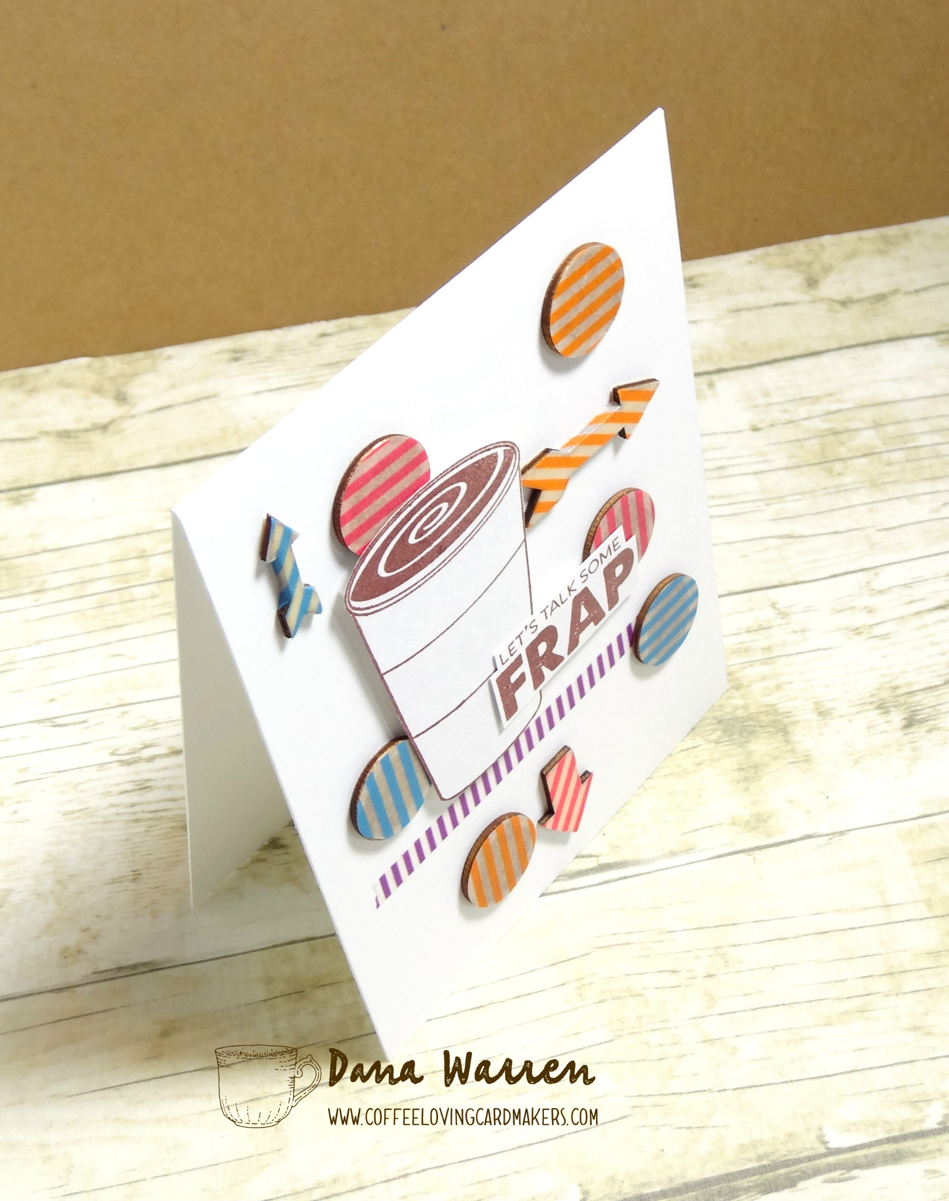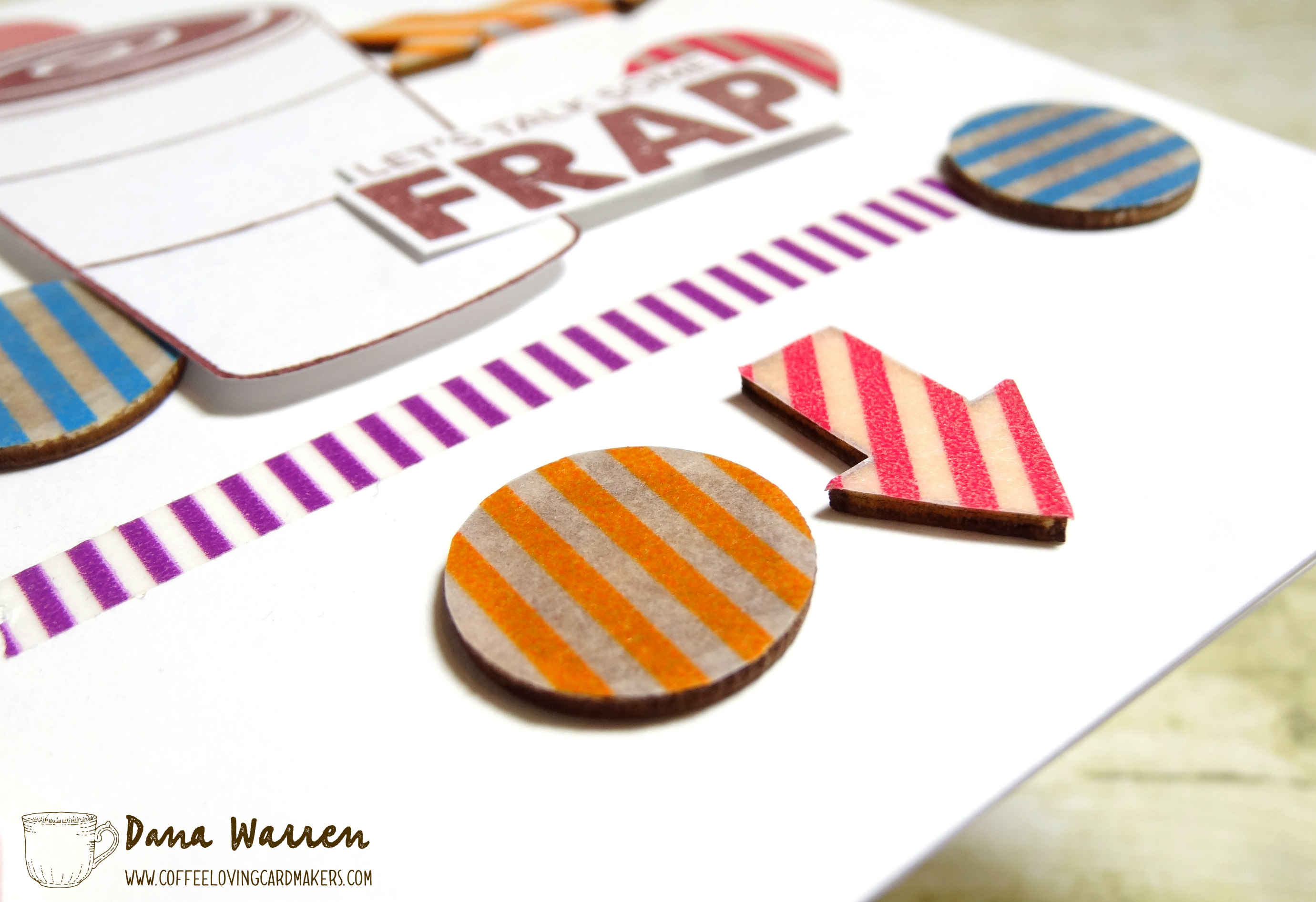 Next, I adhered the washi tape covered wood veneer to a white card base. I also added a strip of purple striped washi tape. Then I added the coffee cup and sentiment with foam tape.