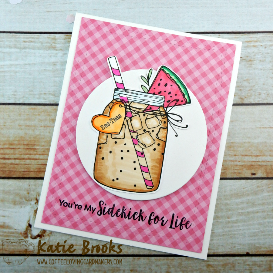I made sure this iced tea had a little kick! 😉 This one has a main image from Graciellie Designs. The “Bes-Teas” sentiment is from The Rabbit Hole Designs. The circle die is from Lawn Fawn, the DP from Sunny Studio Stamps and Wonky Stitches from Avery Elle.