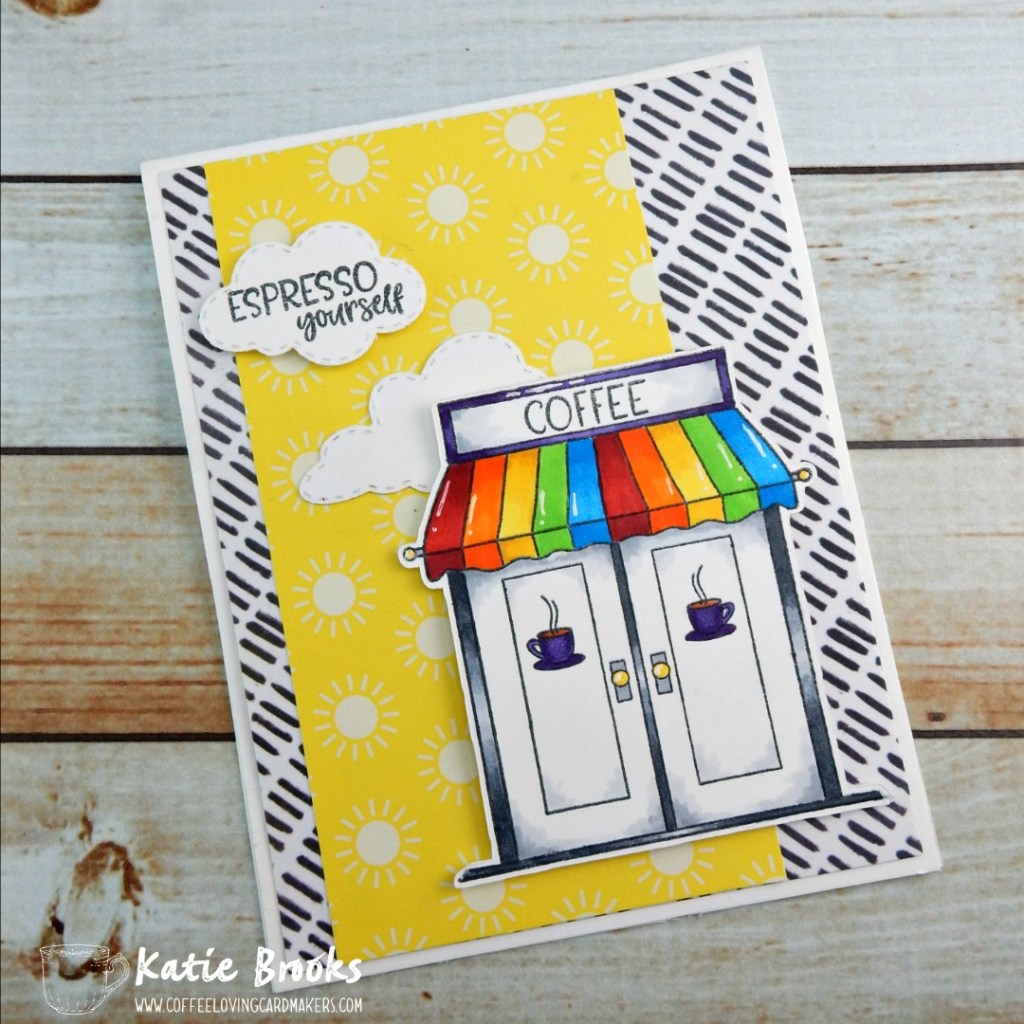 This bright coffee shop is from Miss Ink Stamps Java Joes set and the Clouds are from Trinity Stamps Cloudy Day Die set.