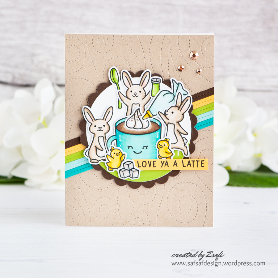 How cute!! Zsofia’s bunny’s tea party scene makes me smile. I also love the springy colors and stitched elements of this card.