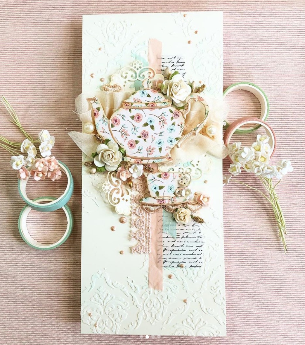 Rebecca’s shabby chic card is so gorgeous. I love the texture she added on the teapot and cup which made them pop. The texture and layers with the stencil, ribbons, die cuts, and flowers are amazing.