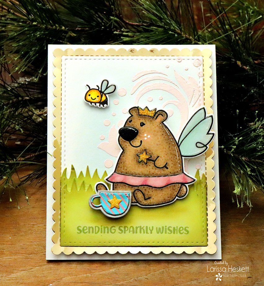 Her card is so sweet, really adorable.  I love the her coloring and the little details!  I want my fairy godmother to be this sweet cuddly coffee loving bear and bee sidekick!