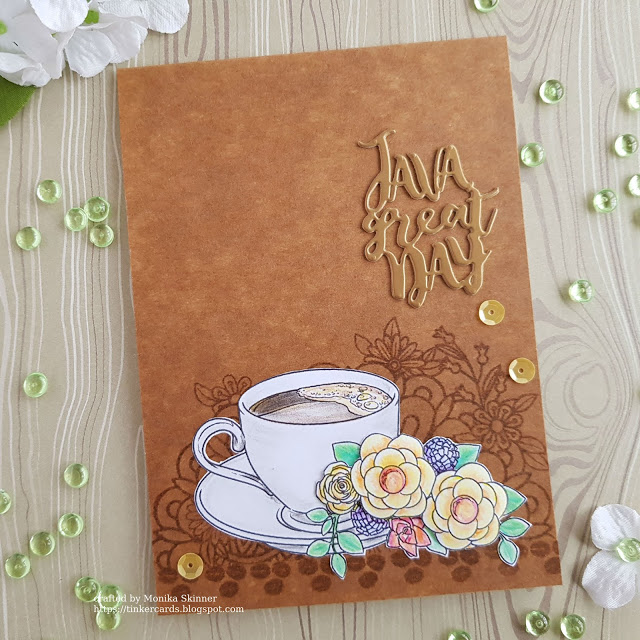I love the kraft color theme, the stamped florals behind the beautifully colored image.  I also love that the sentiment diecut blends so nicely with the kraft cardstock…and those beans…beans, beans, beans!
