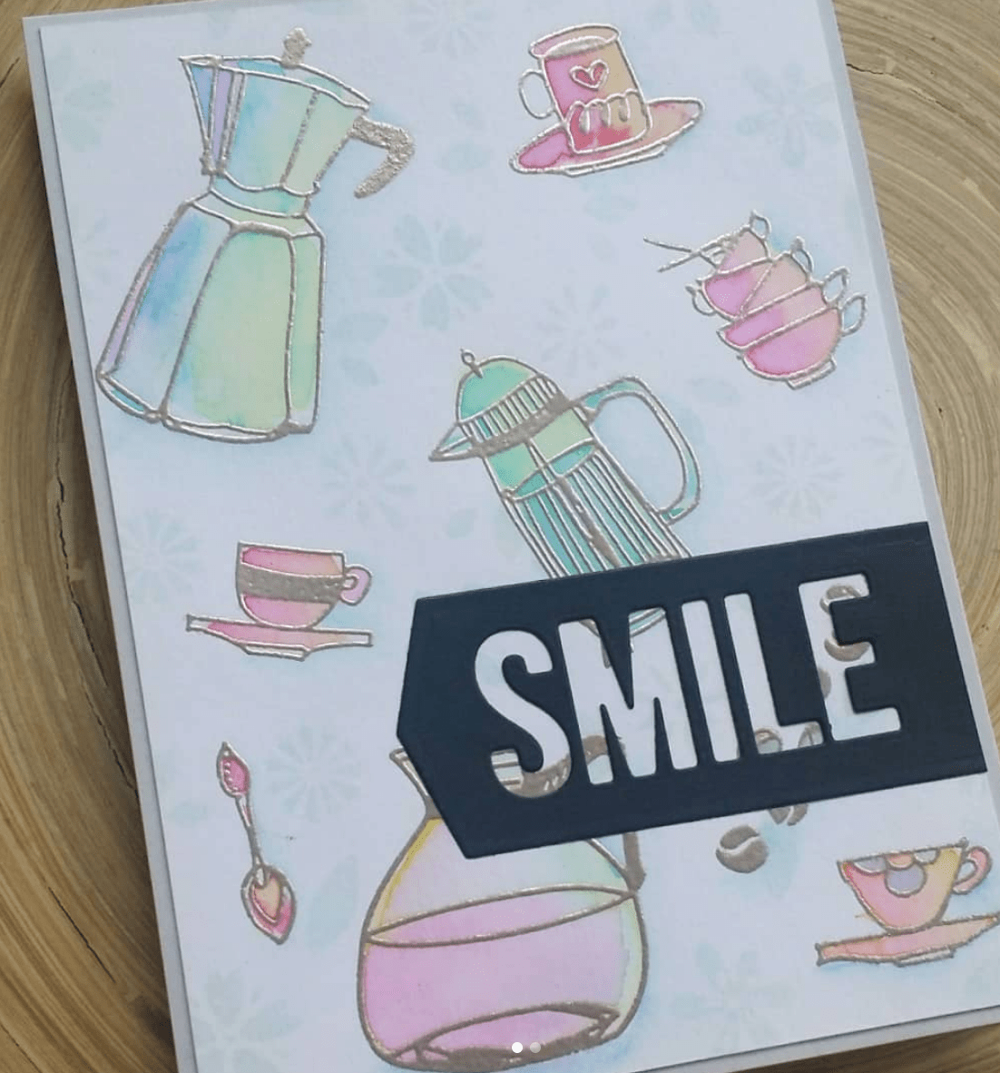 I love the pale colorful watercoloring of the mugs and pots! With the gold embossing I find it very refreshing and spring-ish!!