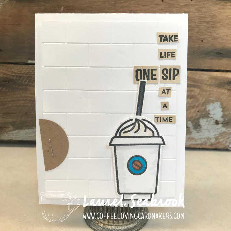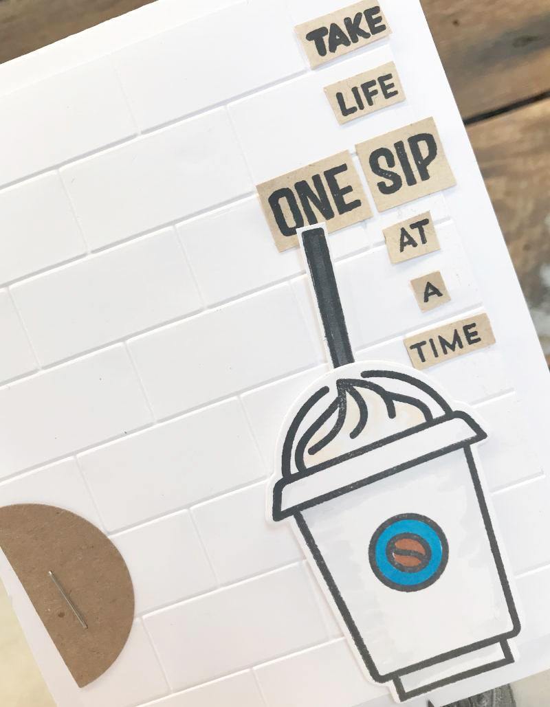 The sentiment is from MFT. I stamped it, cut it apart and then adhered down the side for some interest. The cup is from Honey Bee stamps (Coffee Break). I just stamped, lightly colored with copics cut out and mounted on foam squares.