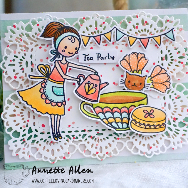 Happy Hello Coffee Lovers…. Annette Allen here with you today for my very first design team post and I am so happy to be here with you all sharing fun coffee themed cards or in today case a Tea Party.