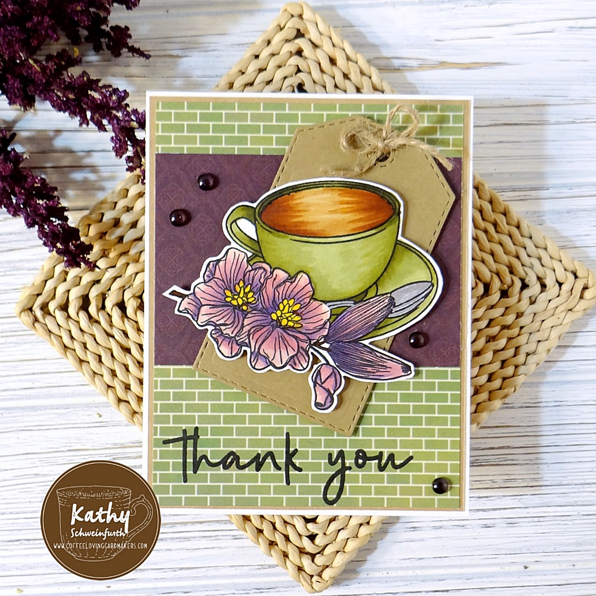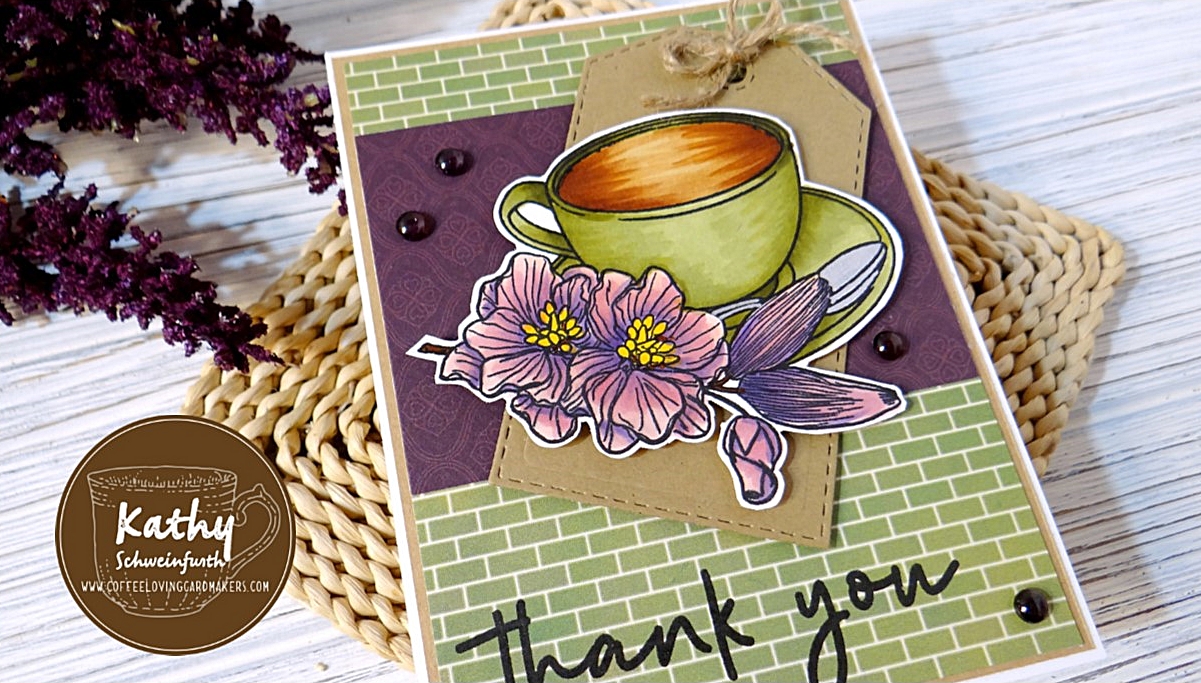 This lovely coffee cup and floral image from STAMPlorations Thank You Coffee set is copic colored and fussy cut. To finish, I stamped the sentiment from this set and added grape colored embellishments.