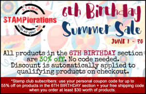 Super Sponsor STAMPlorations is currently having a 6th Birthday sale now through the end of June on all products in the Birthday Section!