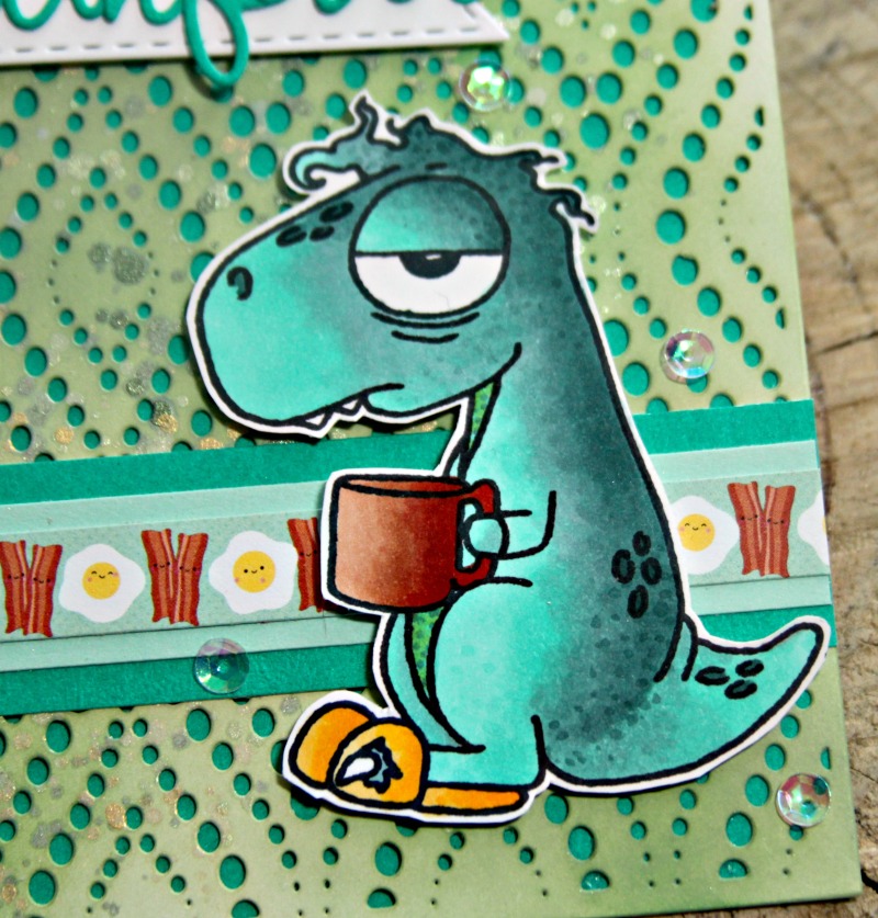 Next… my dino… omg… love his little toe poking out of his slipper!! I colored him in with my Copics and popped him up in the corner… of COURSE he’s having coffee with his food!