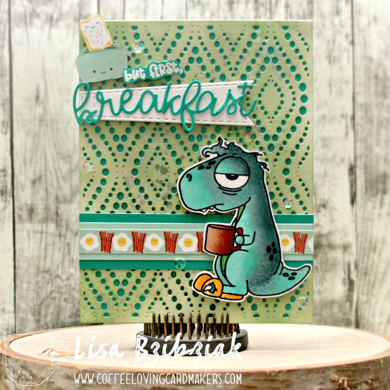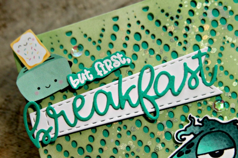 As usual, my challenge was the sentiment… I mean.. no one has the sentiments that tend to flow through my brain…lol! I LOVE to build them using various stamps and dies. For this one I grabbed the “but first” from a cool La-La Land stamp set I got on my last vacation, Take It Sloth… and yeah… it’s got coffee on it too…lol! Then what to do about the “breakfast” part?? Well, luckily I had recently picked up the oh so cool and wonderfully sized Loopy Letters alphabet die set… more vacation shopping…lol! It was just what I needed! I used the Stitched Flag dies from Kat Scrappiness to highlight my sentiment and added the toaster from the So Punny papers along with a few sequins.