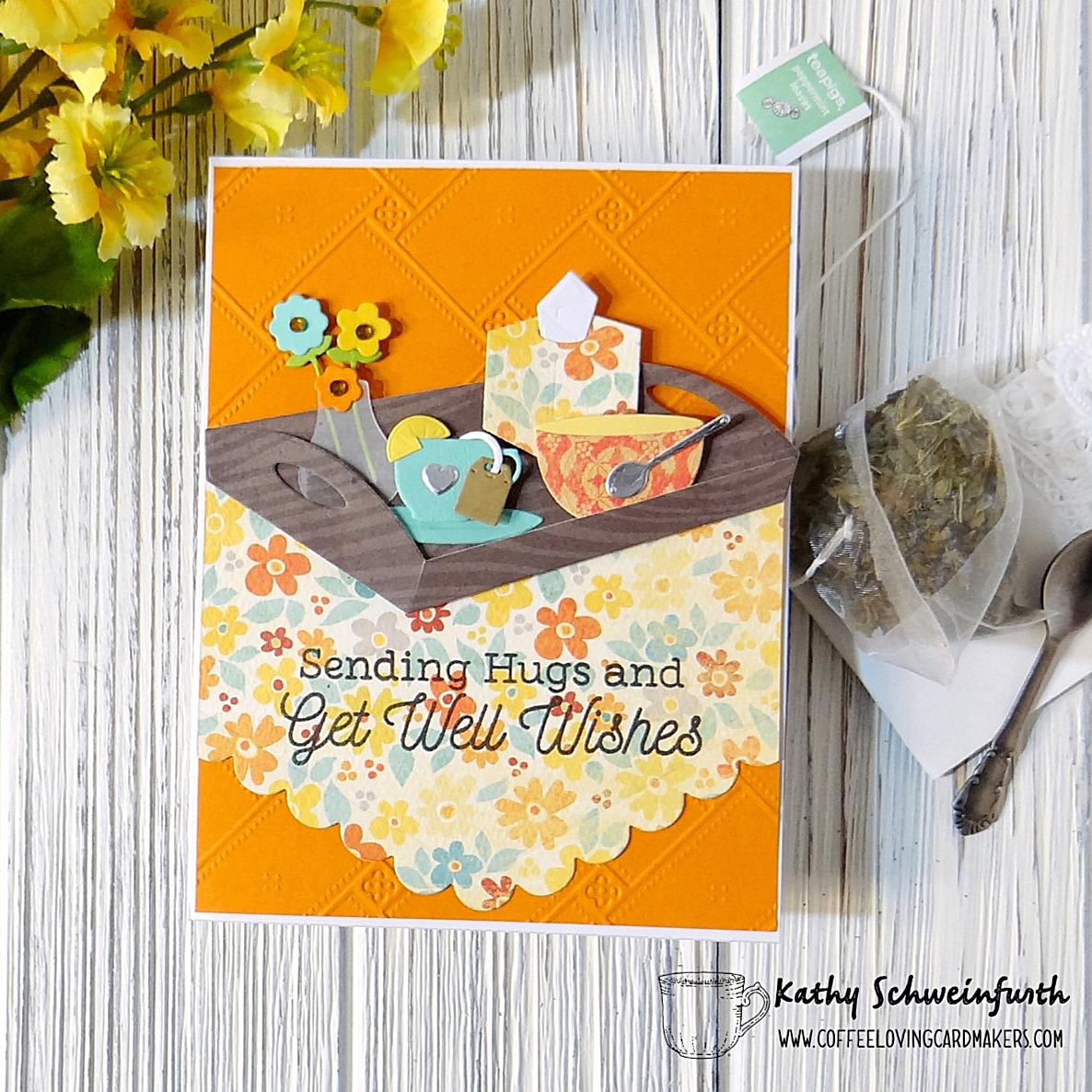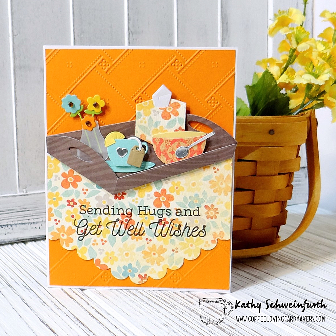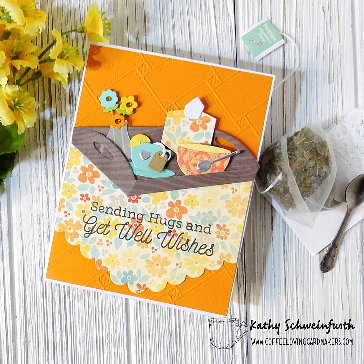 The tray, flowers, bowl and tissue box were from My Favorite Things and the adorable little tea cut with lemon and tea bag are from Divinity Designs Mini Cups & Mugs dies. To finish, I stamped the sentiment from My Favorite Things Feel Better.