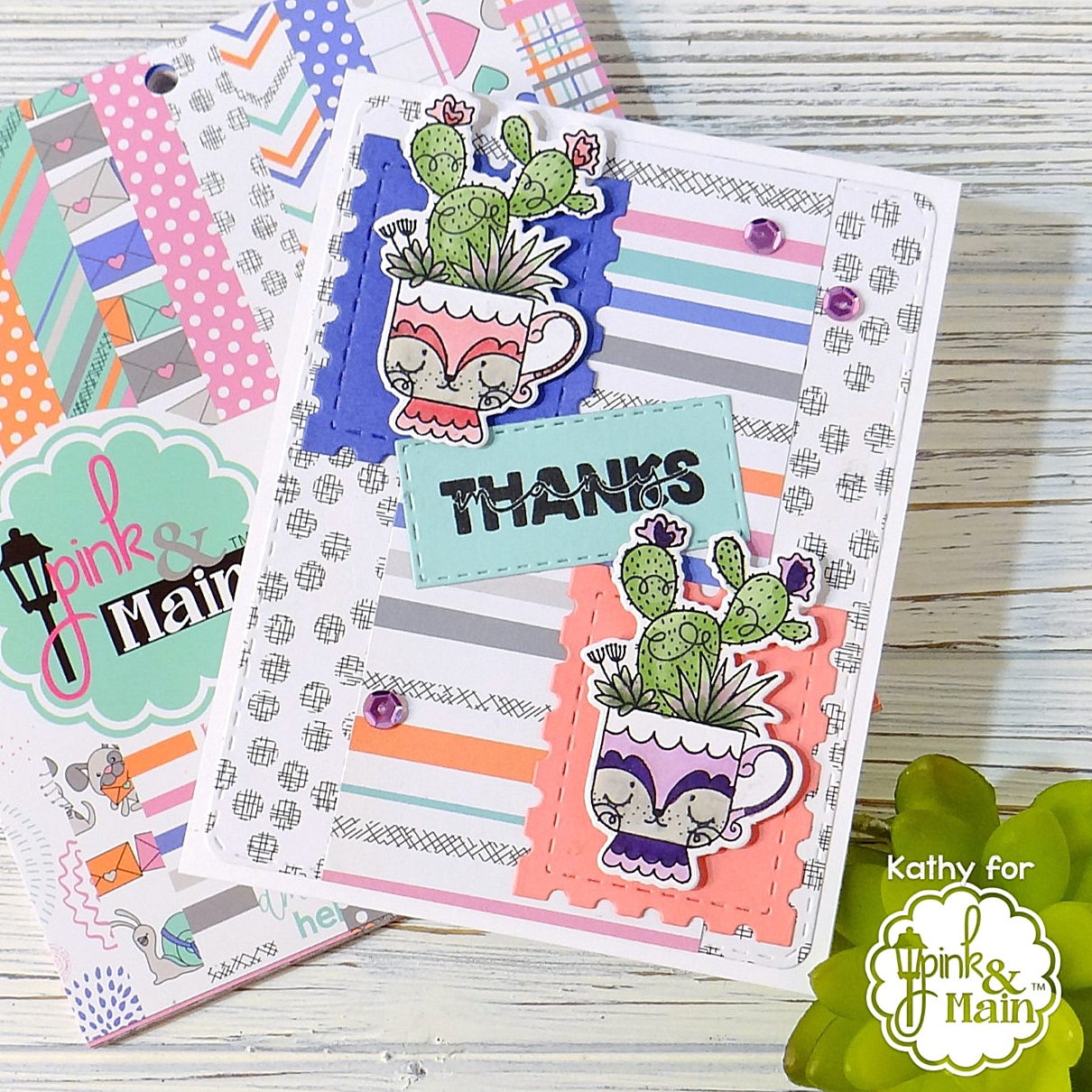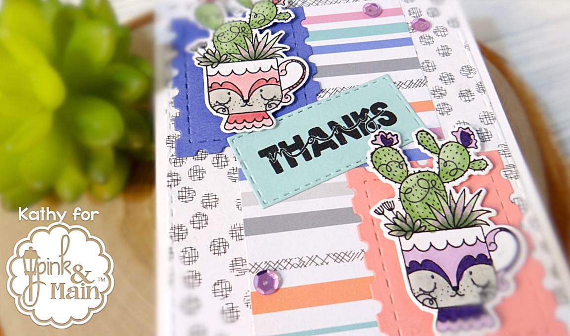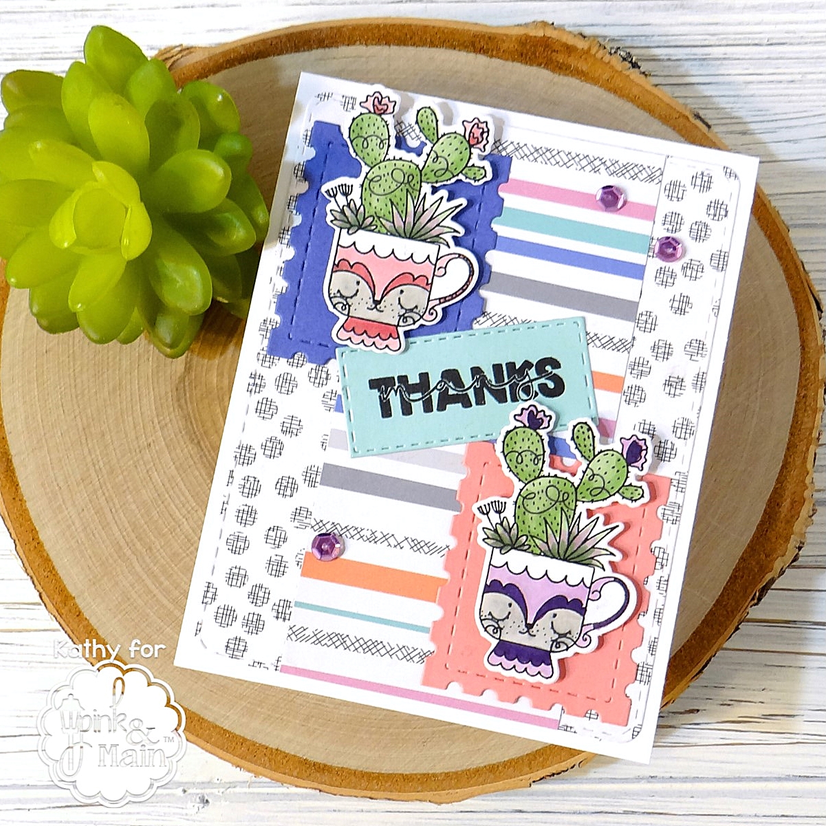 For my card, I first cut one of the pattern papers from the new Pen Pals pad using one of the Stitched Rounded Rectangles Dies and adhered to the card base. I then layered a strip of another pattern from the paper pad in the center. Using the new Stamp Post dies, I cut purple and rose cardstock for backdrops for the darling Succulent stamp images (did I mention how much I just love this set?!) I then stamped one of the sentiments in this set on aqua cardstock and cut with one of the Stitched Rectangles Set 1 Dies .