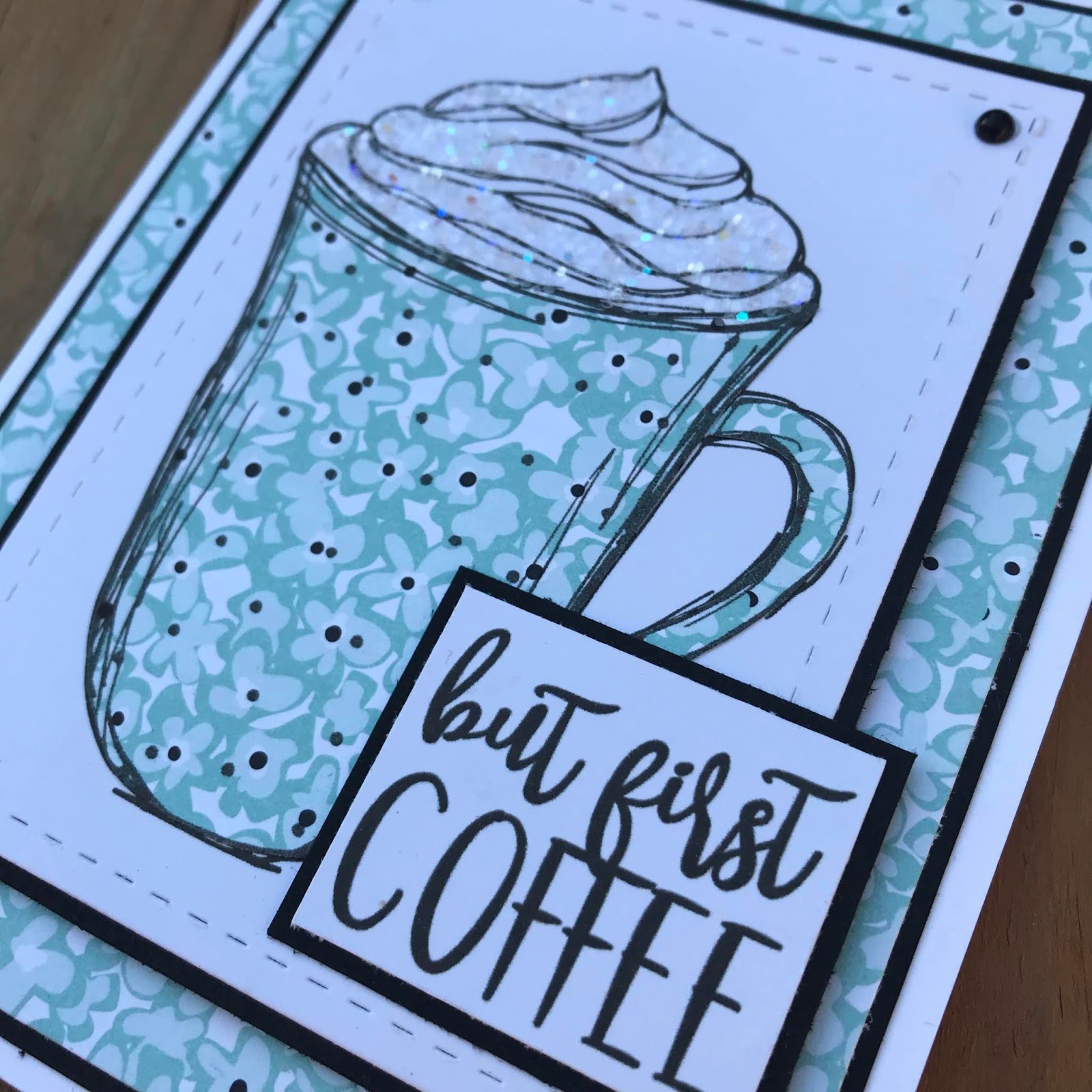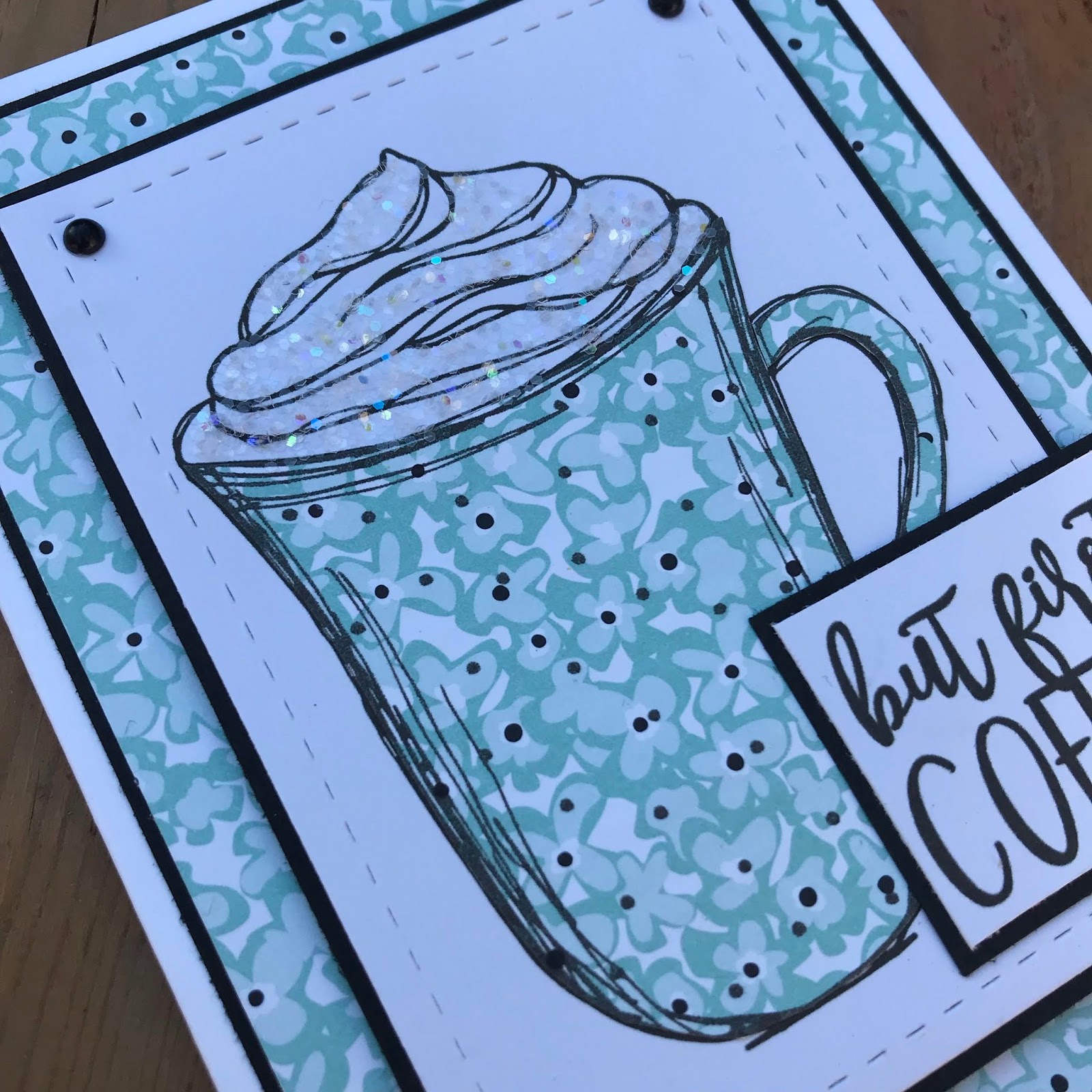 I took part in Gracie’s 25% off sale this past weekend and this super cute cup and sentiment are part of the Coffee Lovers digi stamp set…so fun!I decided to print the mug out on some pretty designer paper as well and paper piece it for a super cute CAS design. I then added some chunky sparkles to the whipped cream and popped it all up with dimensionals…FUN!!