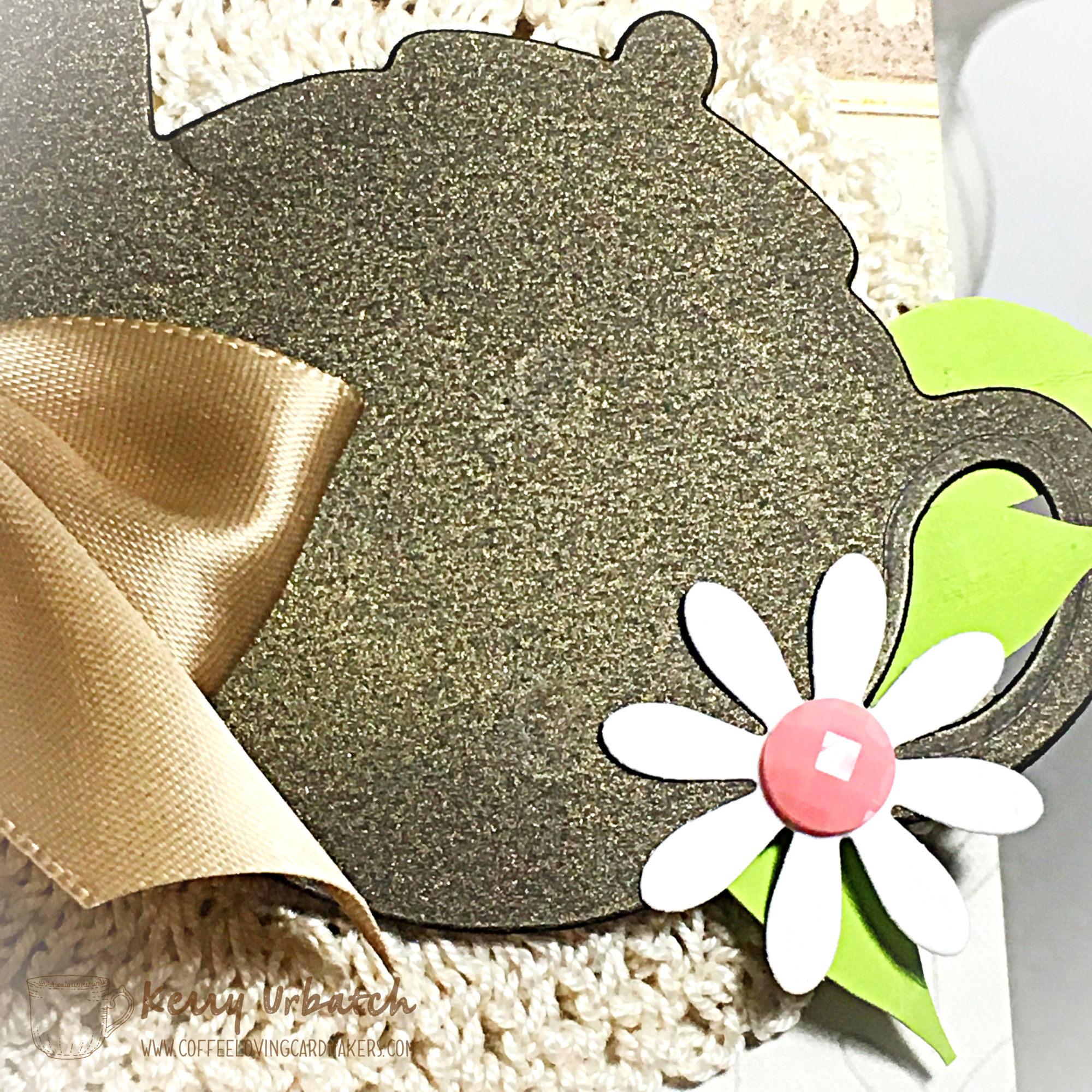 I diecut one of the nested teapots from some dark coffee colored cardstock. After that, I rubbed the cardstock with some Gold Pan Pastel to give it a nice shimmer and sheen. Next, I spent some time searching for some coordinating patterned paper. I’ve got TONS to work through and I found the perfect collection of paper for this pairing.