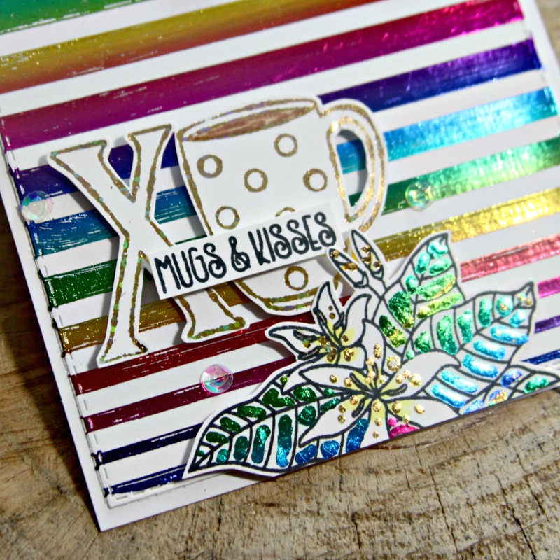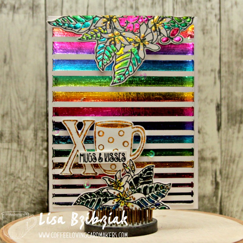 So I wondered how things would go if I used a sponge to apply some Decofoil Transfer Gel using the new Stripes Stencil.  I did not apply a lot.. just a thin coat of the gel and spread it over the stripes from right to left.  I let it dry and then applied some Rainbow Decofoil.  I was very pleased when it came out a little distressed looking!   You may know how I love imperfect things!  I stamped the beautiful coffee plant florals from the Brewtiful set on copic friendly paper intending to color them, but nothing seemed quite right against the striped rainbow background which, even though it was distressed was still quite bright.