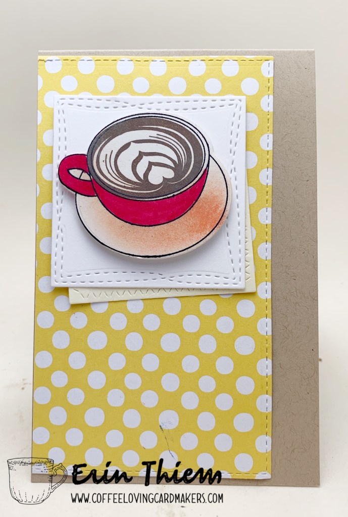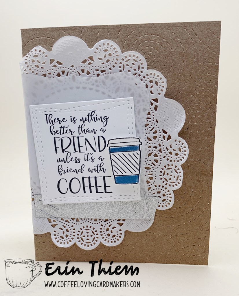 Hello, Erin here with two cards to get your coffee crafty inspirational juices flowing. My first card uses the sentiment from Divinity Designs paired with a MFT coffee stamp, Lil Inkers background die, MFT die, a piece of vellum cut Spellbinders die, silver washi tape and some staples. My second card uses a Lil Inkers coffee stamp and die with MFT dies and a piece of patterned paper from my stash. I went for tall and skinny card size for the second card, sometimes just mixing up the layers, colors and the card shape can help me get creative.