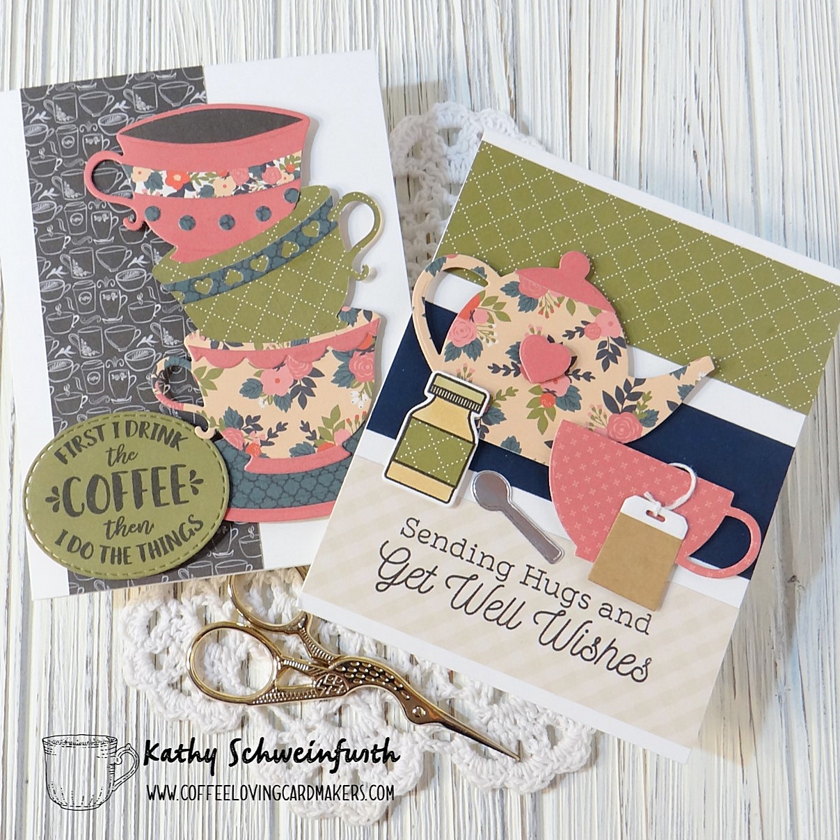 For my first card, I layered a strip of one of the patterns onto the cardbase. The pretty cups were created using Elizabeth Crafts Teacup Dies to cut several patterns from the paper pad. This sentiment is one of my favorites and it’s from Lil Inker Designs Coffee Talk 2 set.