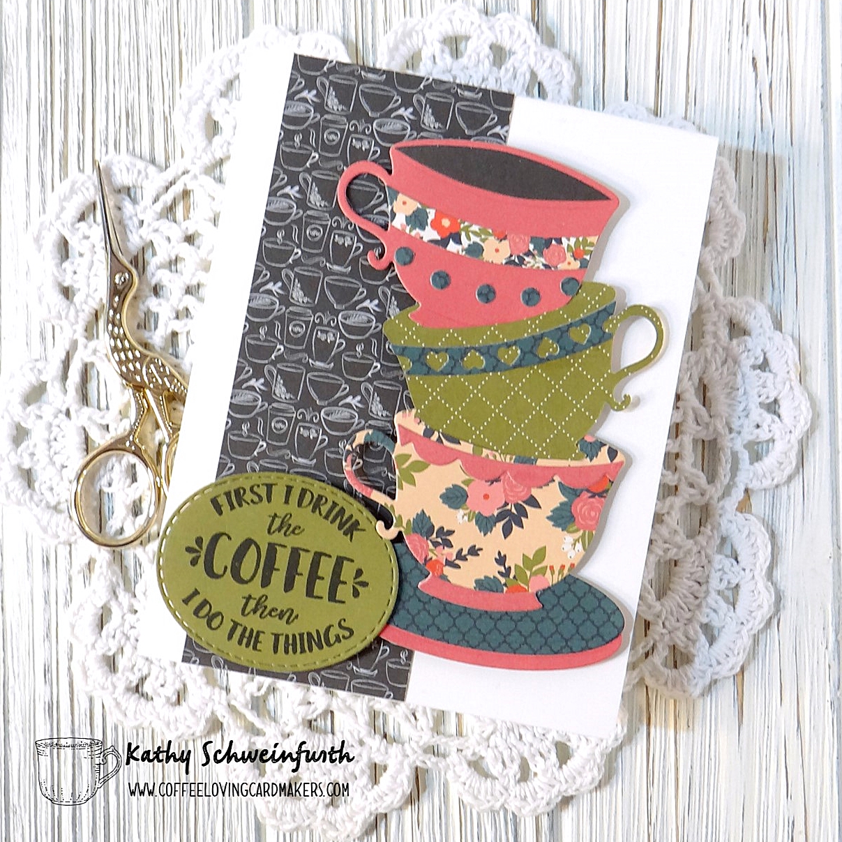 For my first card, I layered a strip of one of the patterns onto the cardbase. The pretty cups were created using Elizabeth Crafts Teacup Dies to cut several patterns from the paper pad. This sentiment is one of my favorites and it’s from Lil Inker Designs Coffee Talk 2 set.