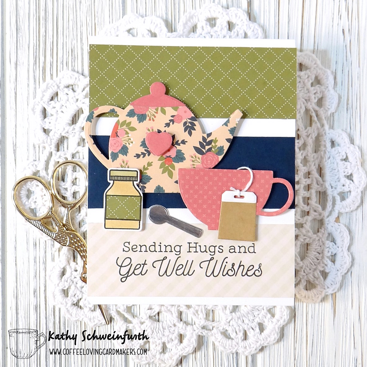 For my next card, I used patterns from the Echo Park Coffee paper pad and navy cardstock adhering strips to the card base. Two of my favorite MFT products were used here: Feel Better stamps and coordinating dies plus Tea Party dies. I stamped one of the sentiments onto the bottom paper strip.