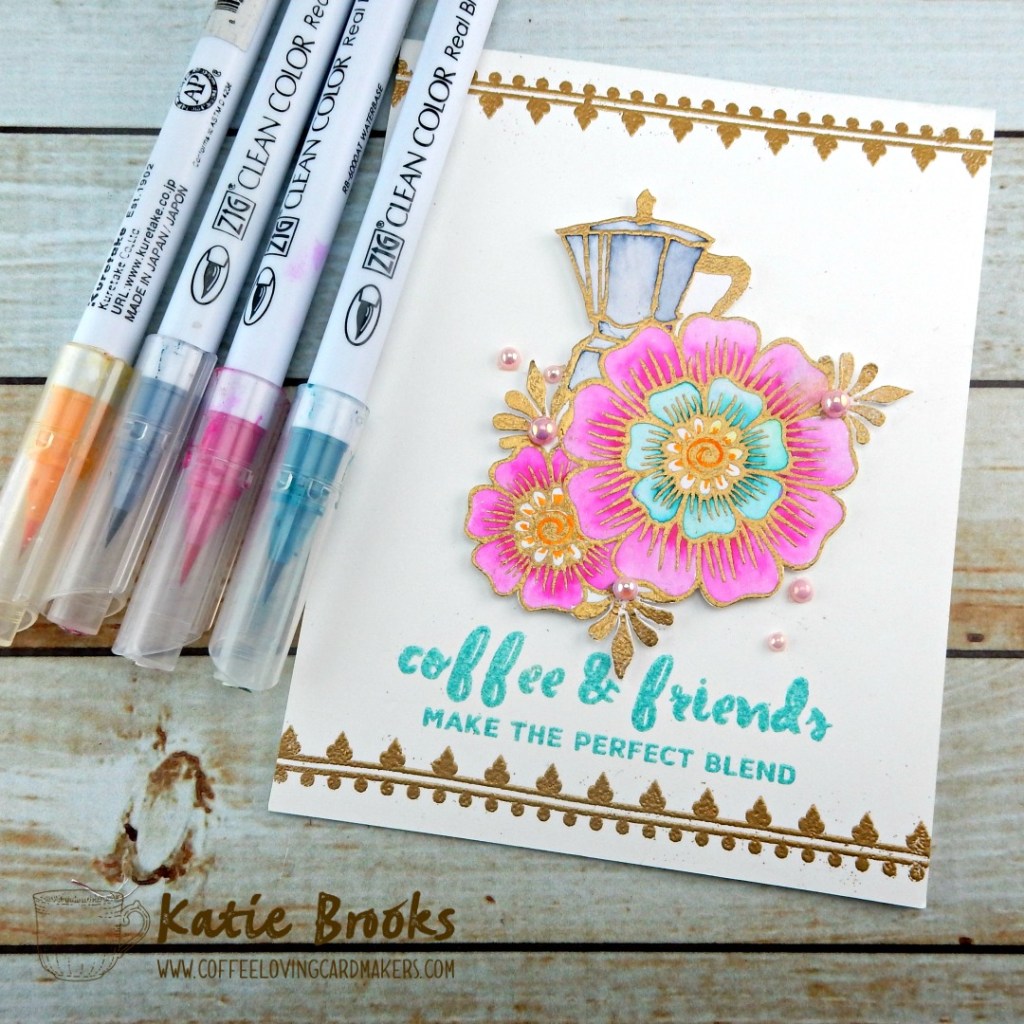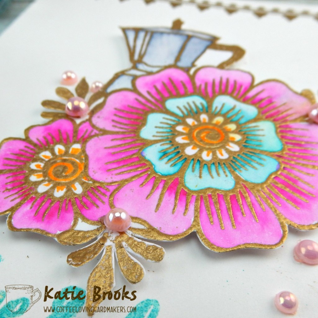 For my creation today, I really wanted to pull from the feel of the inspiration image, the golds and texture, it all feels so amazingly exotic. So I decided to use two set from super sponsor Altenew. I am embarrassed to say that this is the first time I have used the coffee set… cough…don’t hate me! I coupled the elements with two different embossing powders from Super Sponsor Wow Embossing Powder. I stamped the images on Watercolor paper and used my zigs to create the color, then I cut them out and mounted them on this one layer card (not my typical). The embellishments are from Super Sponsor Trinity Stamps. Here is a close up of the blooms: