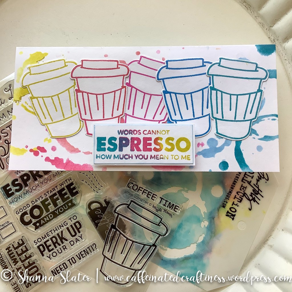 OK, let me share Shanna’s amazing project using our inspiration. She used one of our Coffee Hop Super Sponsors, Waffle Flower, with Versaclair inks for her main images. She also had a fun Tim Holtz stencil and and MFT sentiment. You can find more details on the how on her blog here.