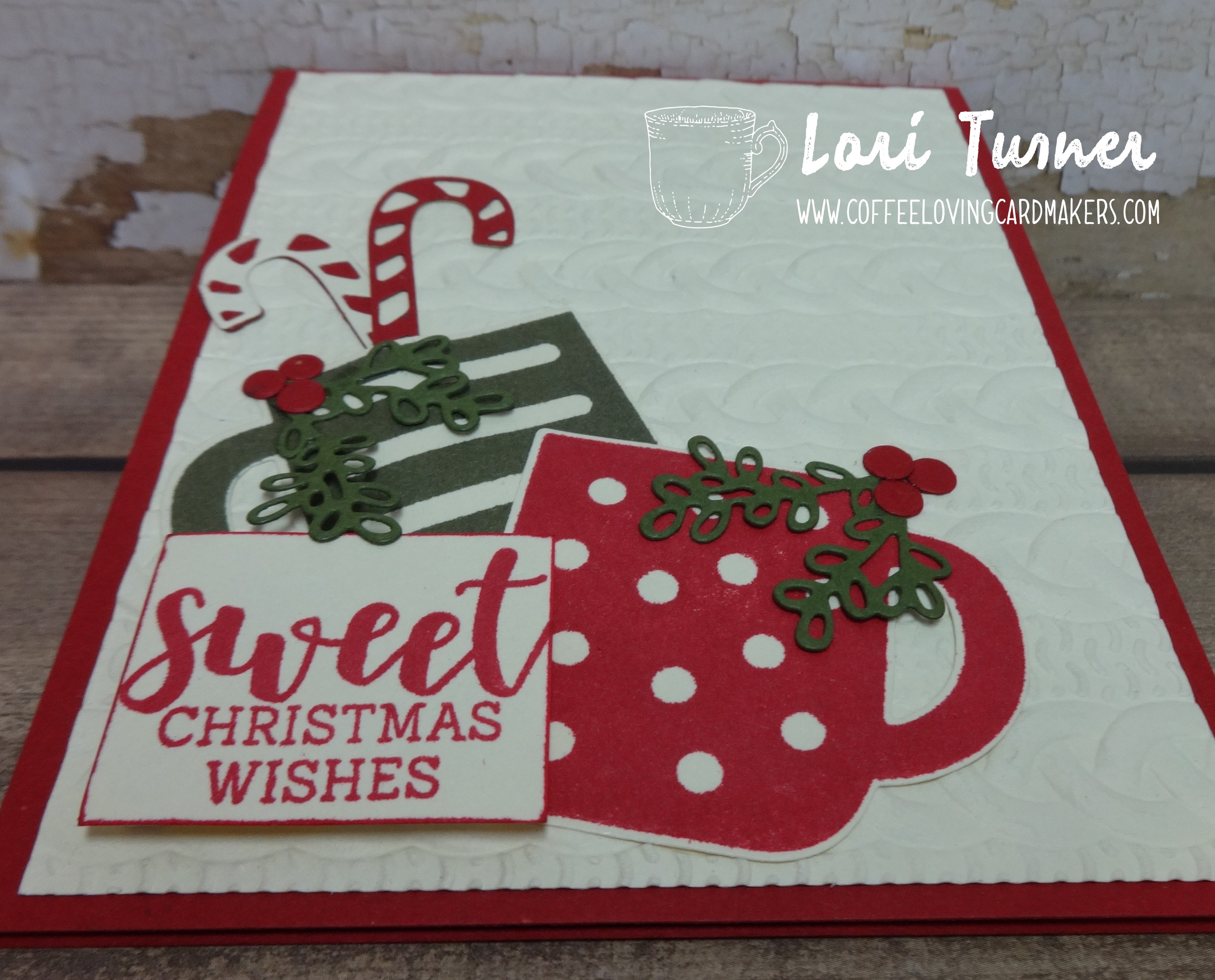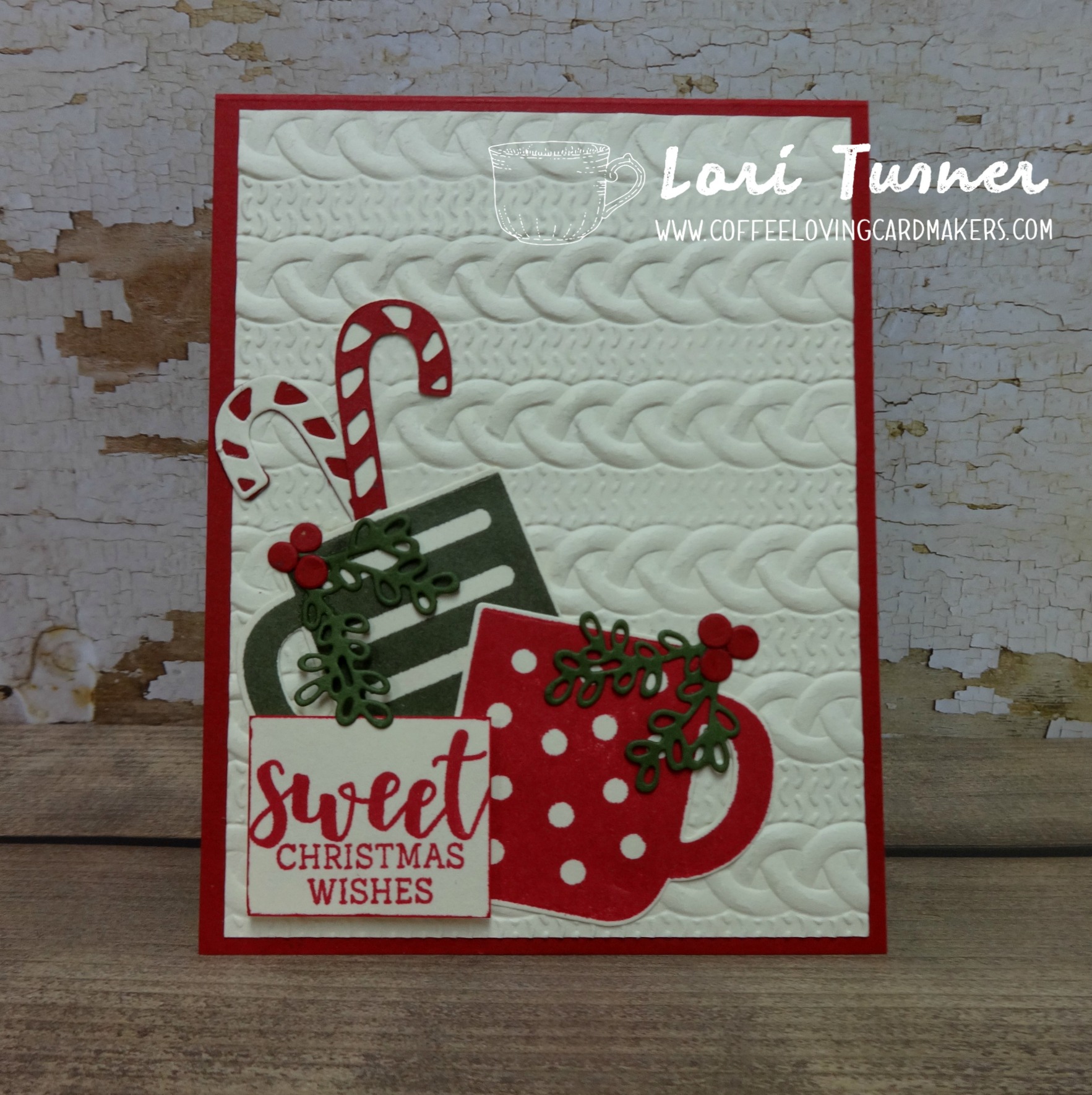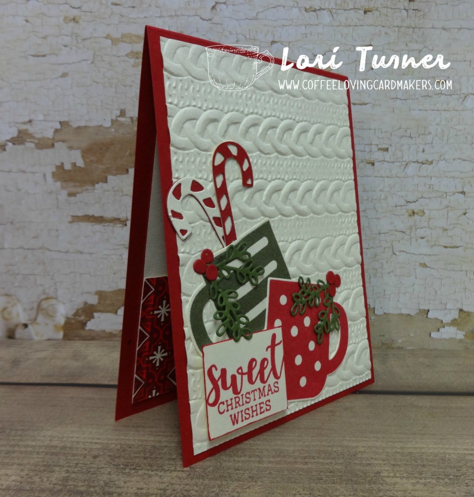 Hello crafty friends…Lori here, sharing this cozy, yummy Christmas card with you all – celebrating National Coffee Day! My card features the newest coffee stamp/die set from Stampin’ Up! and it’s a ton of fun. The stamp set, called Cup of Christmas and the die set, called Cup of Cheer are amazing together and the possibilities with this combo is literally endless! So fun! I also added some texture using the Cable Knit embossing folder – just so cozy!