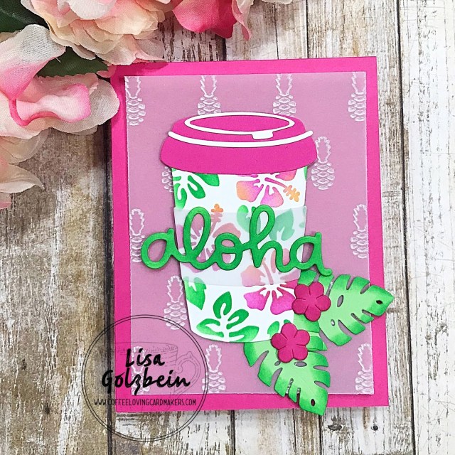 an Aloha die cut from Lawn Fawn on top. The pineapple background was made